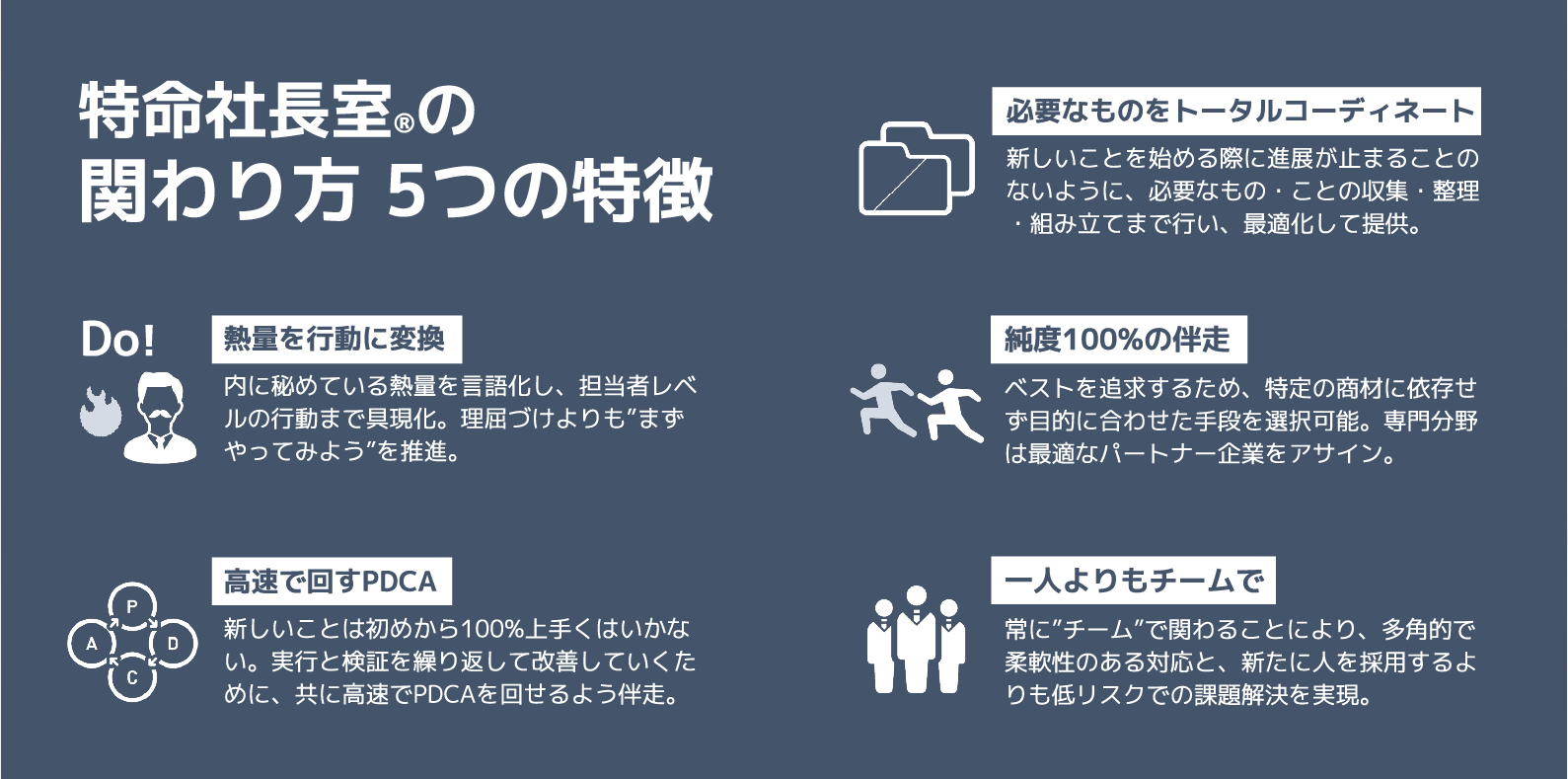 特命社長室®はクライアント様と関わる上で以下の5つの点を大切にしております。
