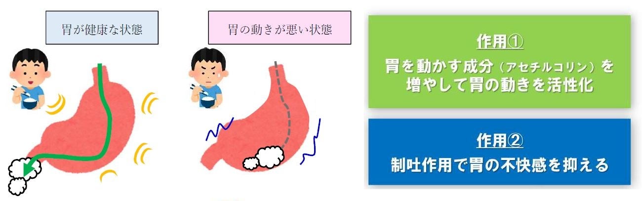 イラクナには、「胃を動かす成分“アセチルコリン”を増やし、胃の動きを活性化する働き」と「制吐作用で胃の不快感を抑える働き」があり、この2つの作用で胃の不快感を緩和します。