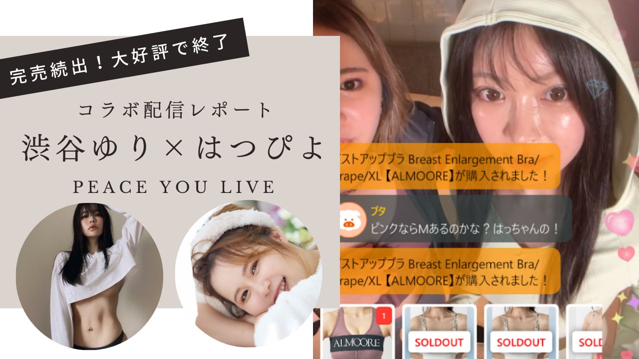 普段は中国を拠点に活動されている人気ボディメイク美容家の『渋谷ゆり』さんが、ご自身がプロデュースされている、着るだけで誰でもカラダが美しく見えるウェア&ランジェリー『ALMOORE』のライブコマースをピースユーライブで実施するために今回来日いただき、本配信が実現しました。ピースユーライブのトップライバー『はつぴよ』さんとコラボいただき、お二人の絶妙な掛け合いをユーザー皆さまに楽しんでいただけたことで、約2時間の配信で完売した商品も多く、配信は大好評で終了しました。