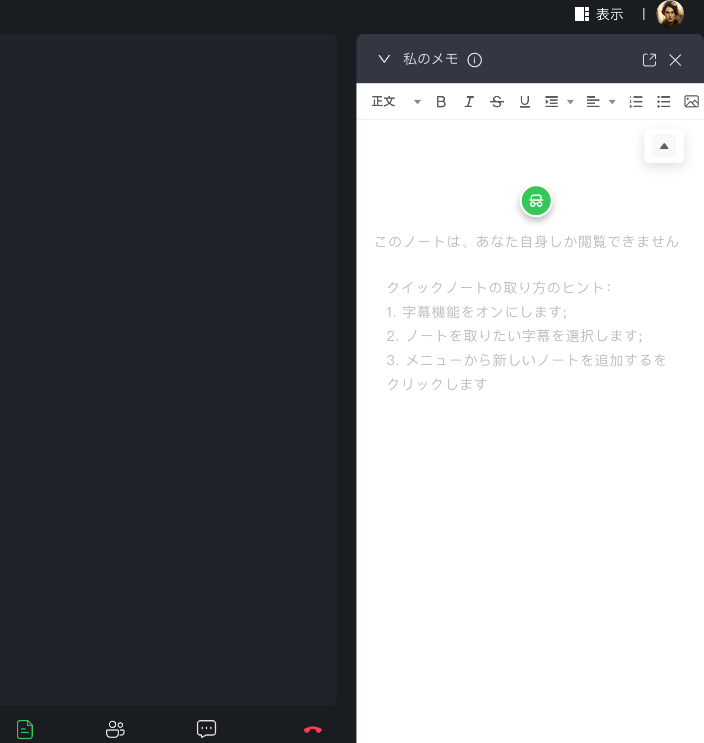 参加者は会議中に、自分のメモを手動で入力することもできますが、同時に会議の字幕機能を活用してメモを取ることも可能です。例えば、英語の会議の場合、参加者は自身のノートに手動で日本語でメモをとる一方で、FeloMeetの字幕機能により、英語での会話内容を見ながら確認できます。これにより、言葉として聞いた内容を文字にしてメモする手間が省け、より正確な記録を得ることができます。