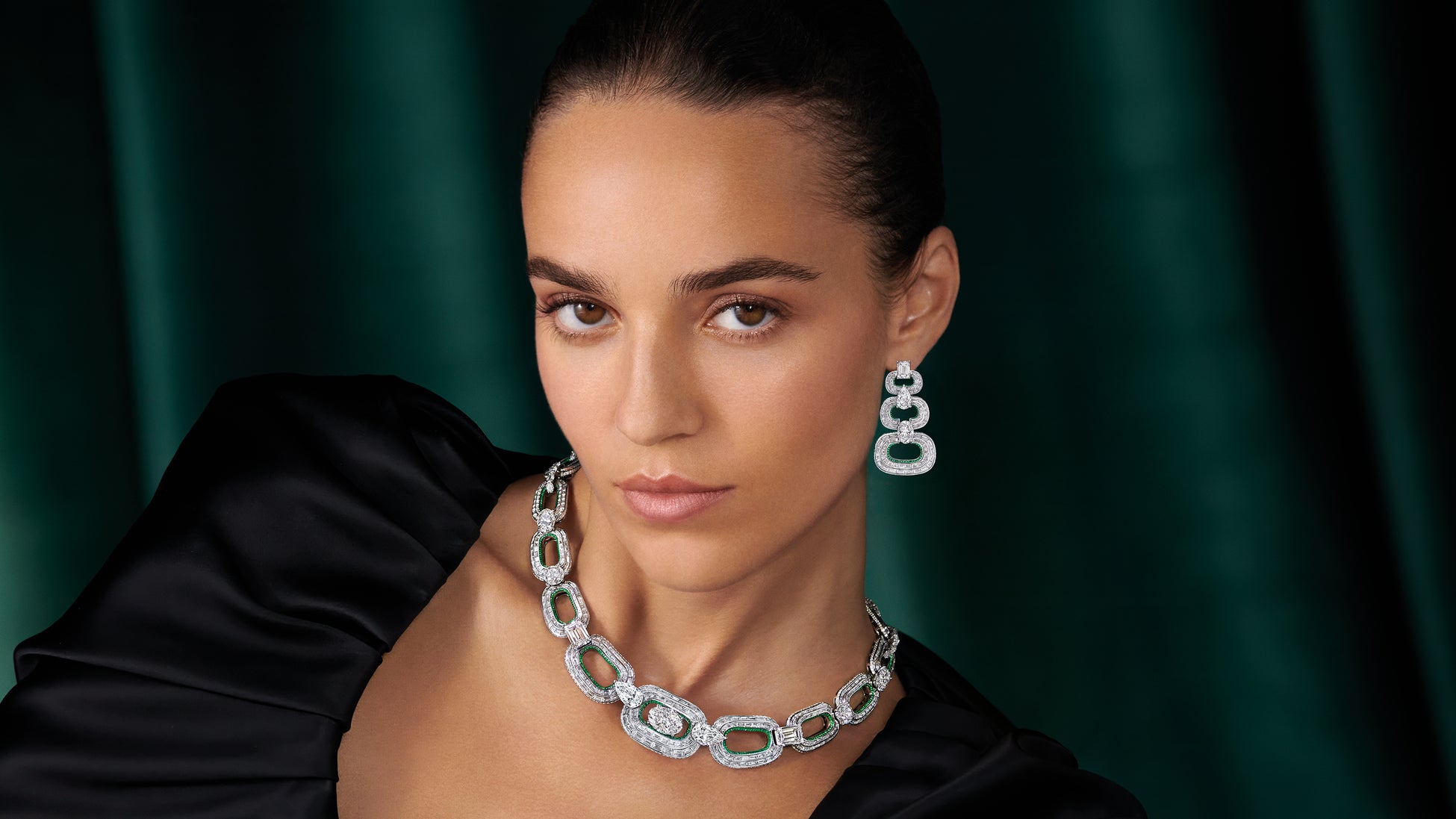 「I WISH」キャンペーンに登場する数多くのハイジュエリークリエイションより、トータル136カラットを超えるダイヤモンドとエメラルドが施されたモダンなチェーンモチーフのハイジュエリー セットが、パワフルなエネルギーを放ちます。モチーフの内側にはラウンドパヴェ エメラルドが巧みに施され、グラフを象徴するカラーであるグリーンの繊細な輝きが、ブランドのシグネチャーとしてジュエリーに彩りを添えます。連なるチェーンモチーフの間には、オーバルシェイプやエメラルドカット、ペアシェイプなどの大粒のダイヤモンドがあしらわれ、魅惑的な輝きを放ちます。
