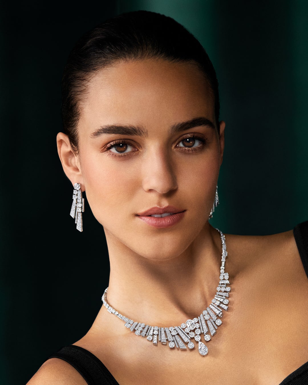 さらに、夜空に降る流れ星のように眩い輝きを放つハイジュエリーセットも登場し、ラウンドブリリアントカット ダイヤモンドとバゲットカット ダイヤモンドが芸術的なバランスにセットされたグラフィカルな美しさで見る人を魅了します。