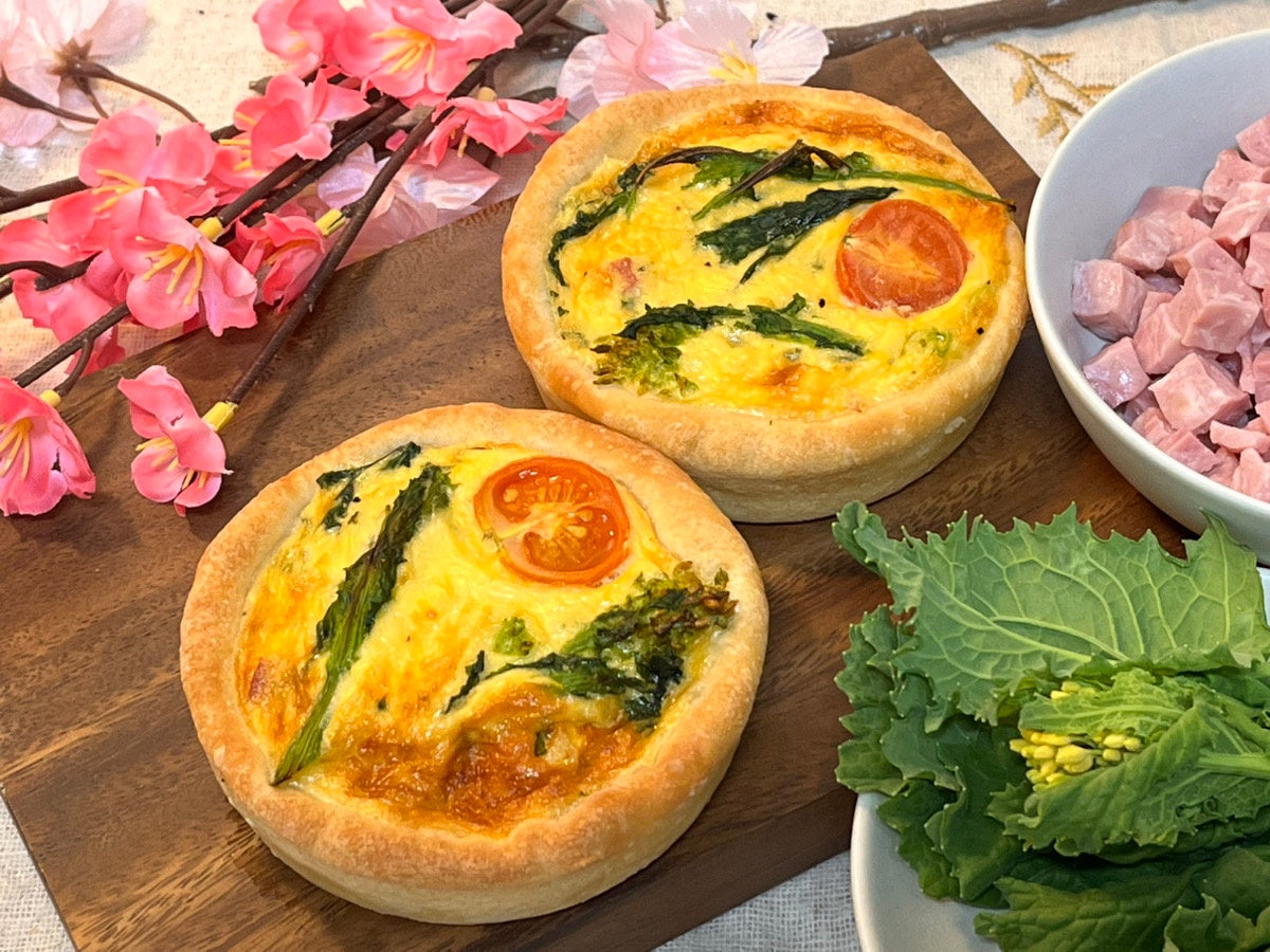 ・人気のキッシュの春バージョン登場!菜の花やベーコン、じゃがいもにトマトが入った具沢山なキッシュです。ぜひ温めてお召し上がり下さい♪