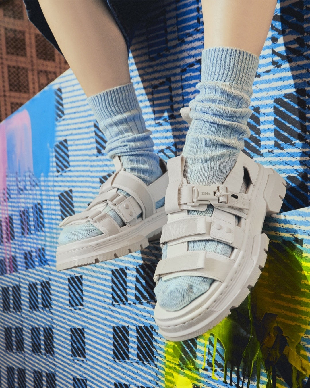 全国のドクターマーチンショップでは、アーティスト ano が表現する世界観を落とし込んだ、ビジュアルをキャンペー ンと同時に楽しむことができます。ドクターマーチンのサンダルコレクションは、素足はもちろん、カラーソックスな どで様々なスタイルであなたらしさを自由自在に表現できます。