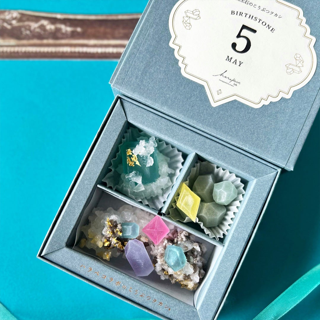 「ArtなFoodであそぶ」をテーマにプロダクトを展開するメルティングポットハラペコラボ株式会社(所在地:福岡県福岡市、以下 ハラペコラボ)から、代表作の鉱物みたいな琥珀糖「こうぶつヲカシ」で、5月の誕生石エメラルドを表現した5月限定ボックスが登場。公式オンラインショップ、福岡本店、他にて2025年4月22日より販売を開始しました。