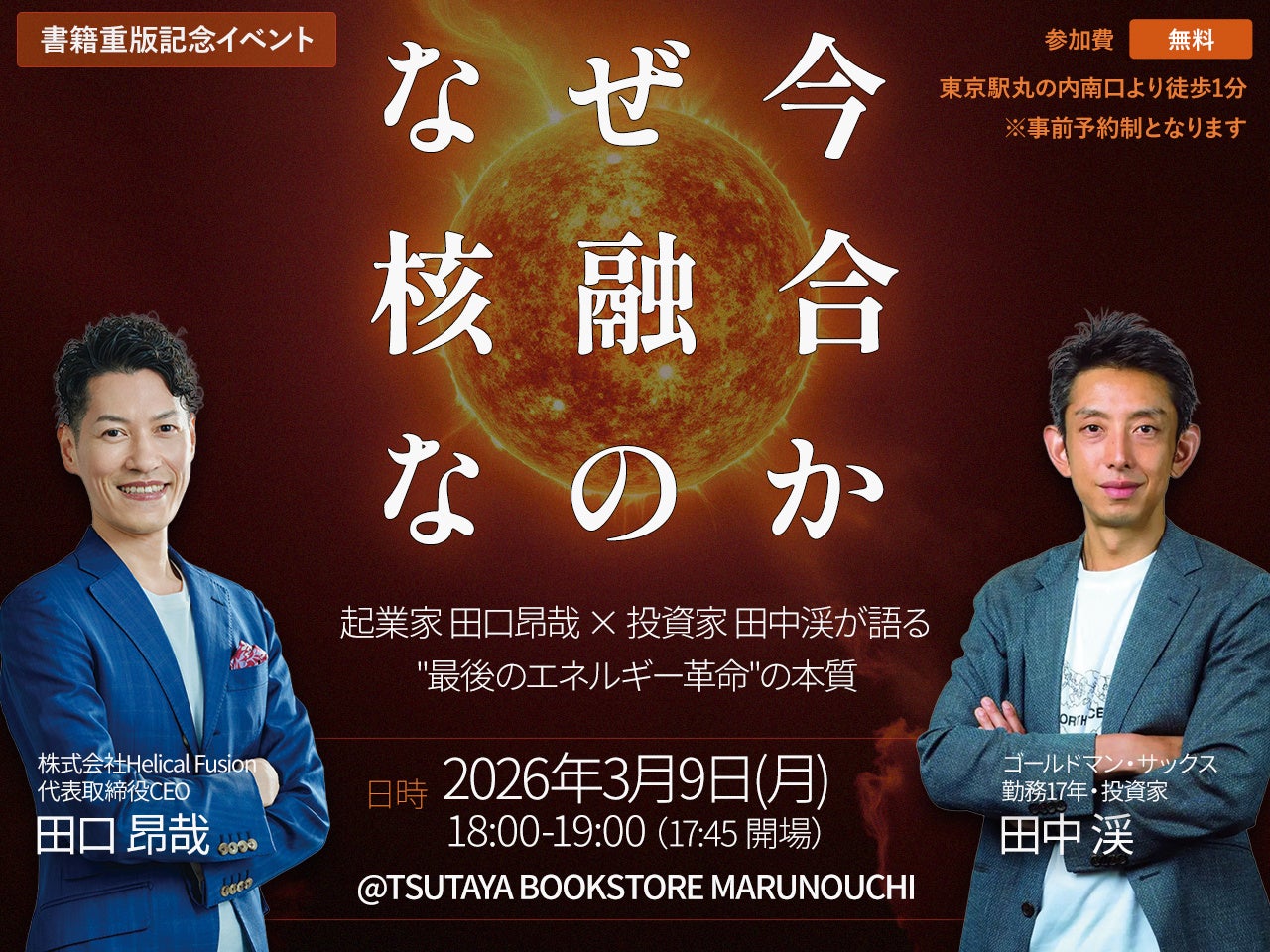 重版を記念して、2026年3月9日に都内大型書店にて、著者によるトークイベントを開催いたします。元ゴールドマン・サックスの投資部門日本共同統括の田中渓氏を迎え、本書のテーマの一つである核融合によるエネルギー革命が人類や社会に与えるインパクトと意義について語ります。また、哲学で修士を持ち、金融やコンサルティング業界を経て核融合の社会実装に挑む田口と、物理学のバックグラウンドを持ちグローバルな投資領域で数々の先端テクノロジーを支援してきた投資家の田中氏が、自身の経験やビジョンを踏まえ、様々な専門性を掛け合わせたこれからのキャリアと挑戦のあり方を考察します。