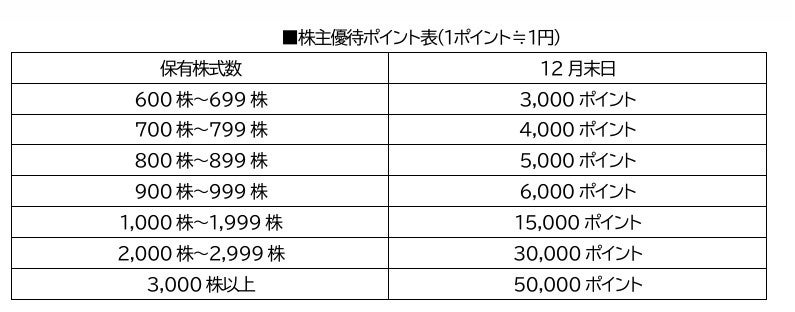 進呈条件:2024年12月以降、毎年12月末日の株主名簿にそれぞれ、6単元(600株)以上保有する株