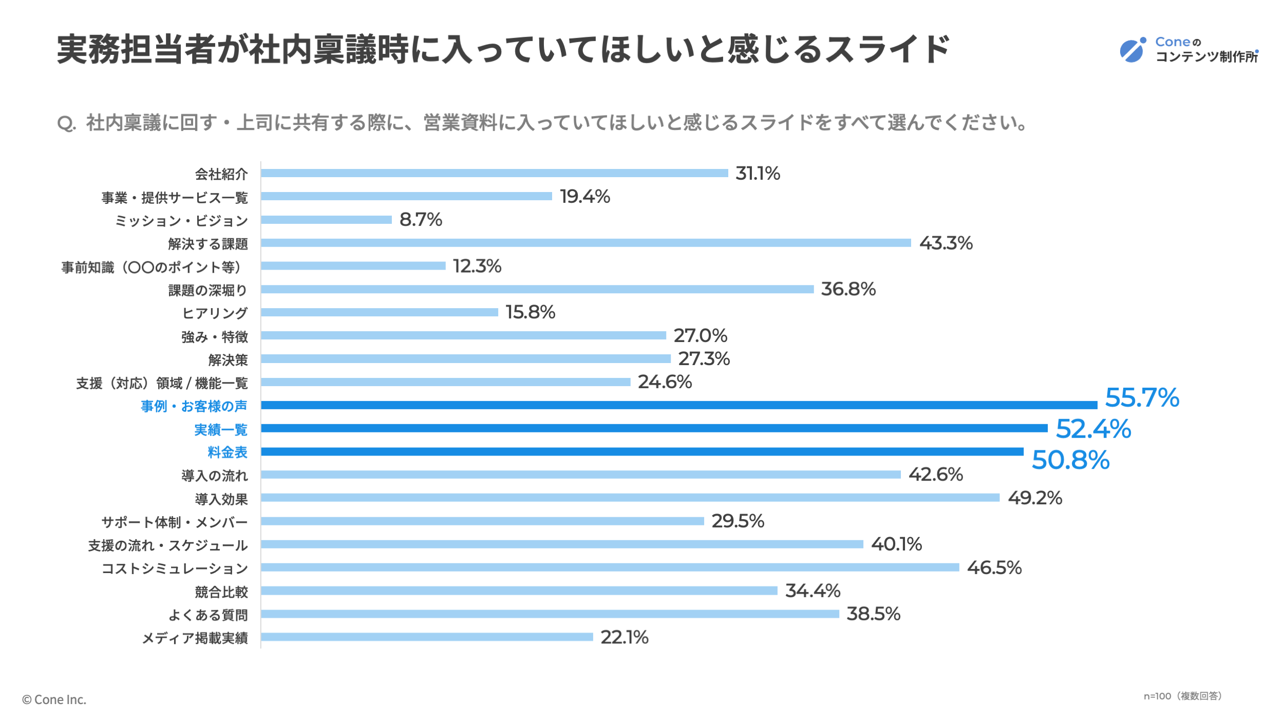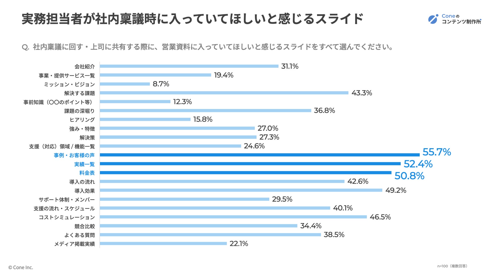 実務担当者層(係長・主任・一般社員)100名に「社内稟議に回す際に入っていてほしいスライド」を尋ねたところ、1位「事例・お客様の声(55.7%)」、2位「実績一覧(52.4%)」、3位「料金表(50.8%)」という結果となりました。