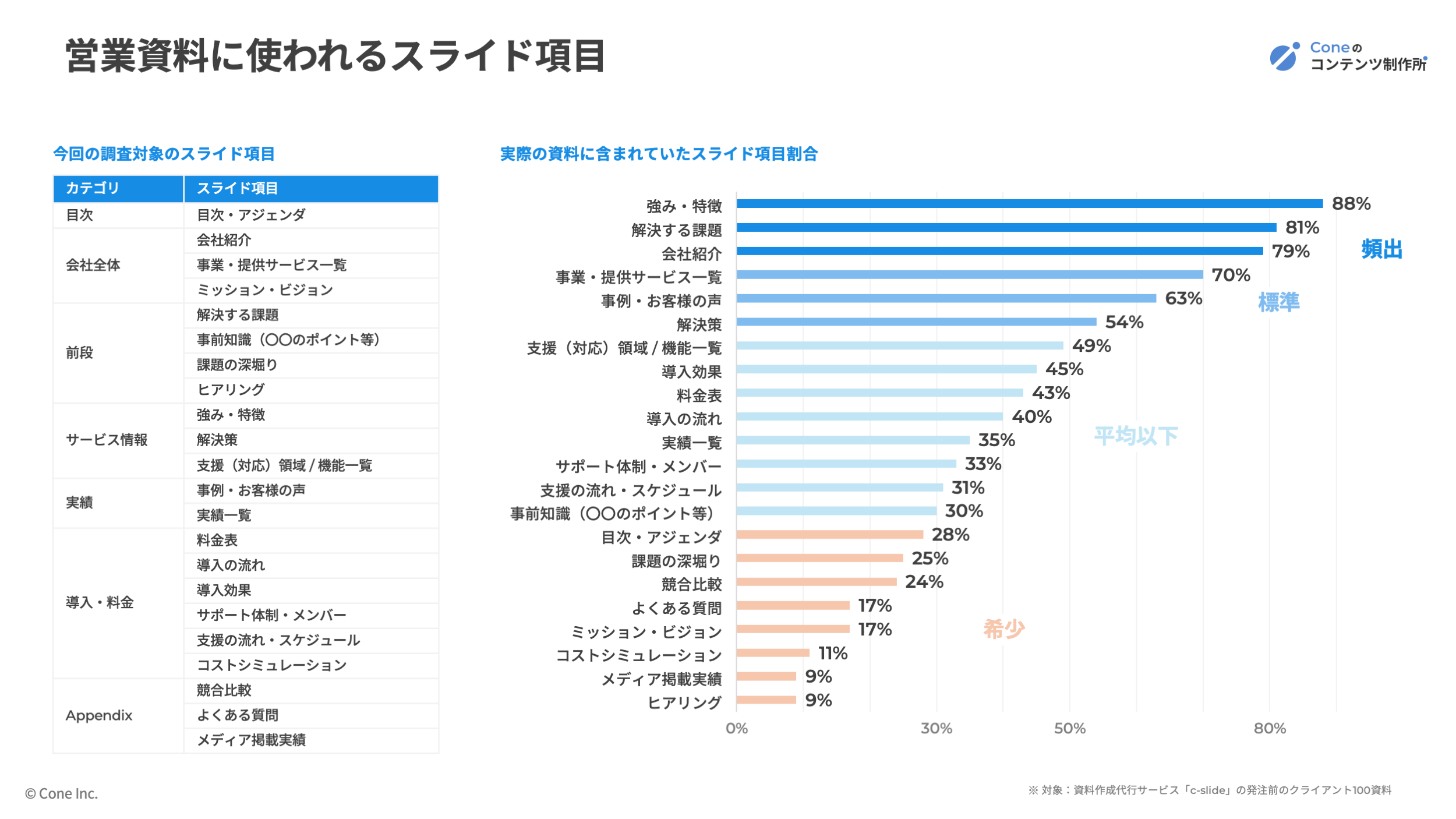 100の営業資料のスライド項目分析。標準的な構成とベストプラクティスの違い