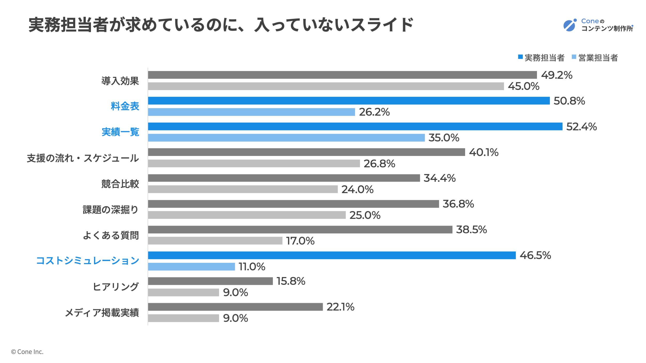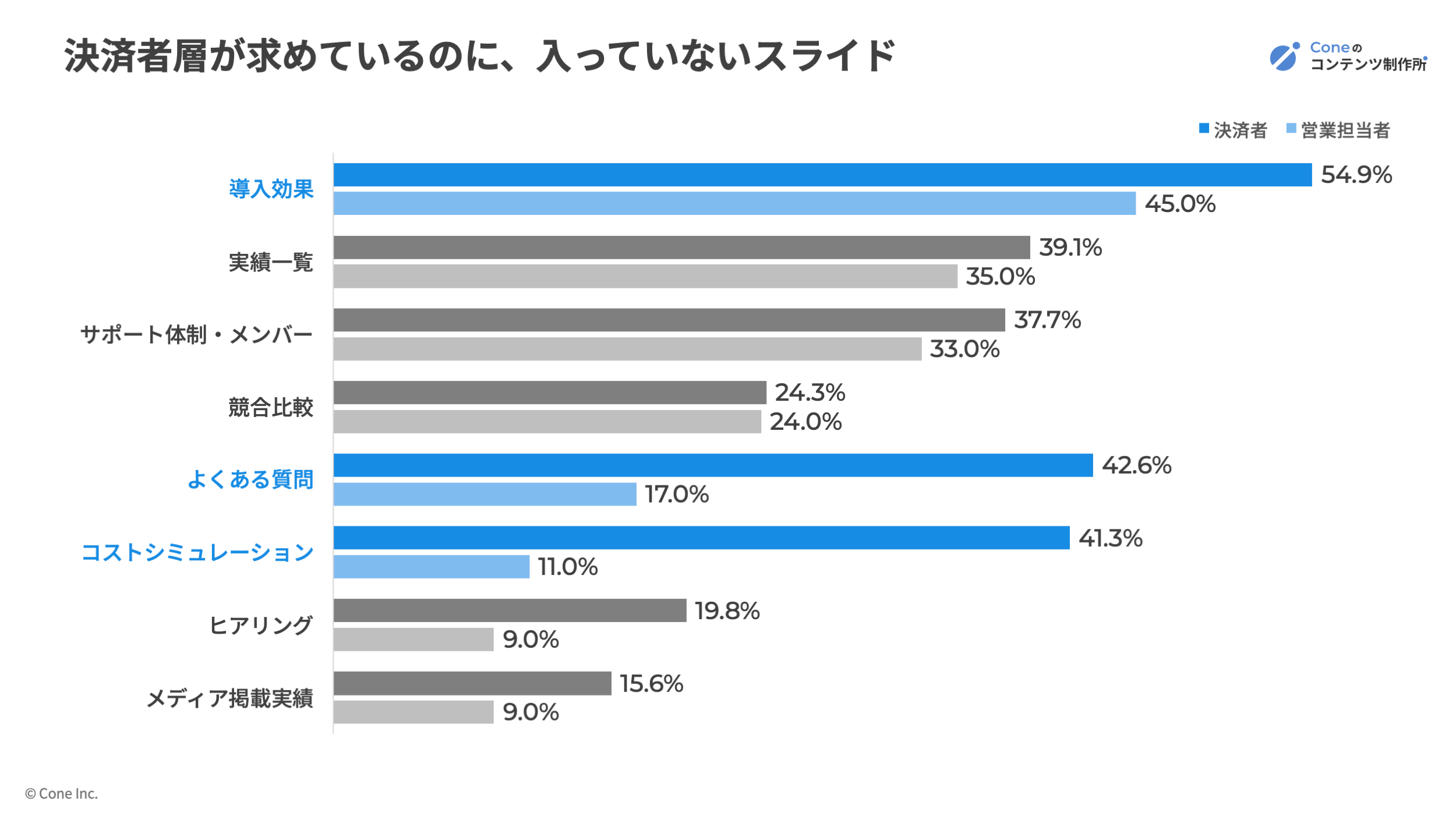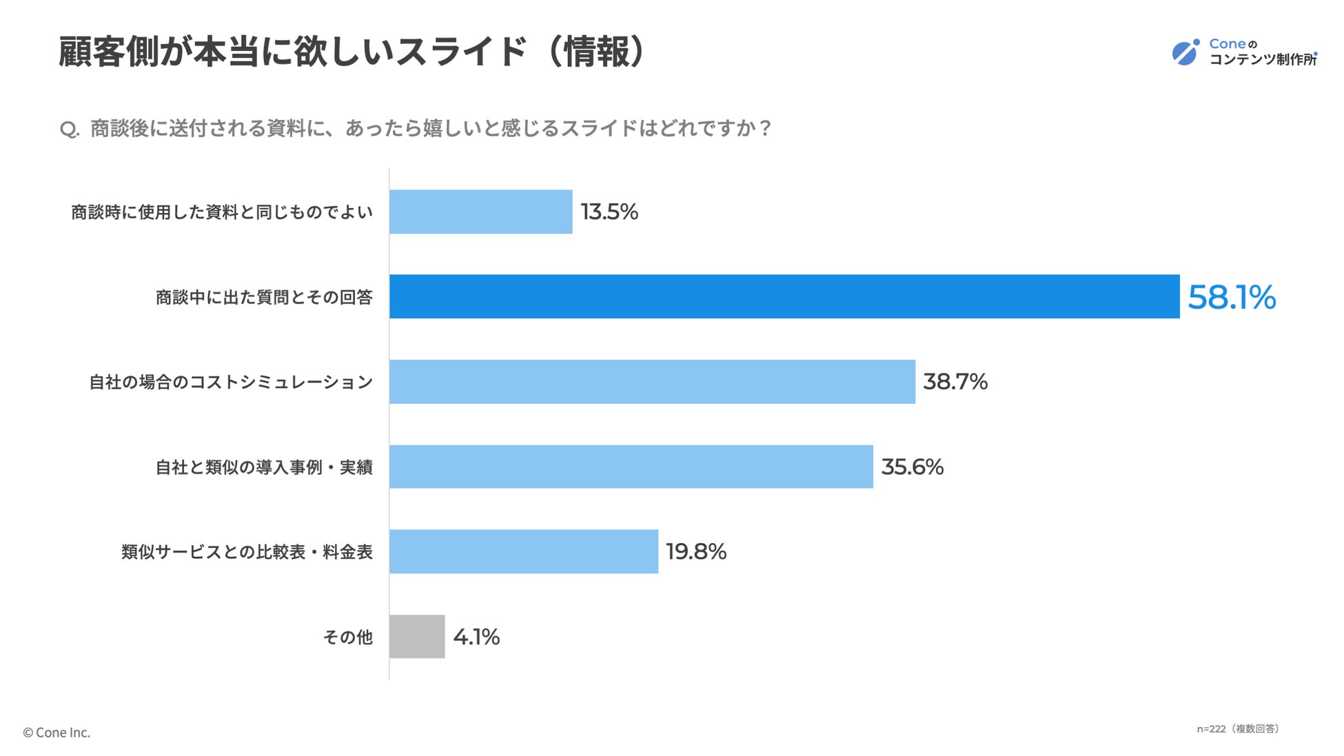 株式会社Cone(本社:大阪府大阪市、代表取締役:佐藤 立樹)は、2024〜2026年に支援した営業資料100件のスライド項目分析と、過去2年以内にBtoBサービスの導入検討に関わった顧客側222名へのアンケートを実施しました。