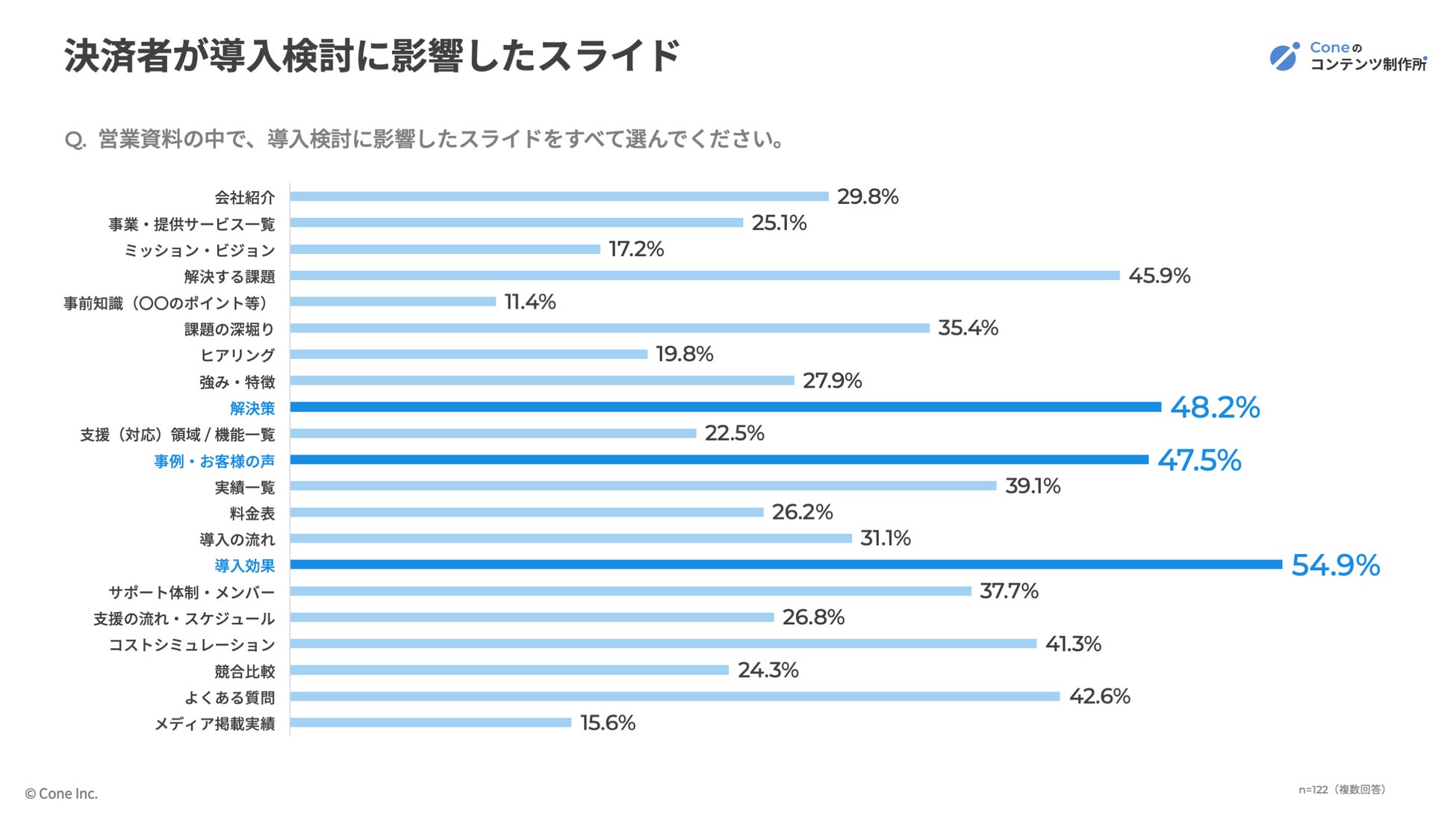 決済者層(経営者・役員・部長課長クラス)122名に「導入検討に影響したスライド」を尋ねたところ、1位「導入効果(54.9%)」、2位「解決策(48.2%)」、3位「事例・お客様の声(47.5%)」という結果となりました。