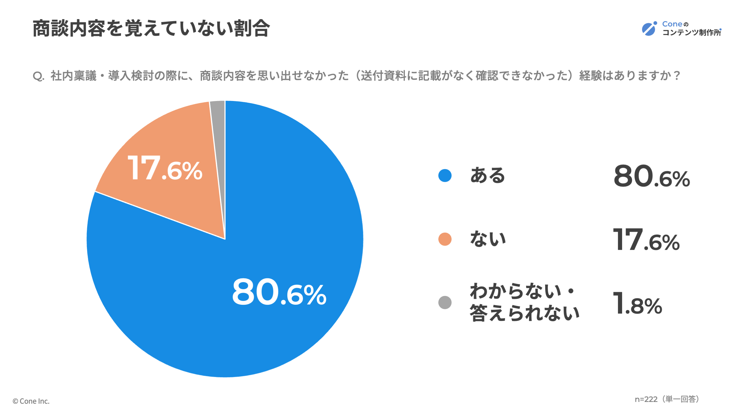 「社内稟議・導入検討の際に、商談内容を思い出せなかった経験があるか」という問いに対し、80.6%が「ある」と回答しました。