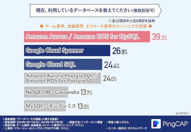 「現在、利用しているデータベースを教えてください (複数回答可)」と質問したところ、『Amazon Aurora / Amazon RDS for MySQL (39.3%)』と回答した方が最も多く、次いで『Google Cloud Spanner (26.9%)』『Google Cloud SQL (24.4%)』と続きました。