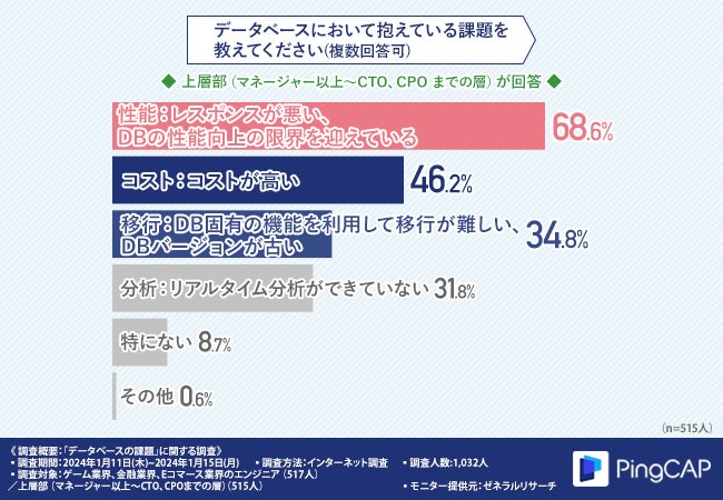 現場のエンジニアを対象とした調査結果で、エンジニアがデータベース利用において「性能」や「コスト」といった課題を抱えていることが明らかになりましたが、上層部が抱えている課題においてもレスポンスが遅いことやコストが高いといった同様の課題を抱えていることが示されました。