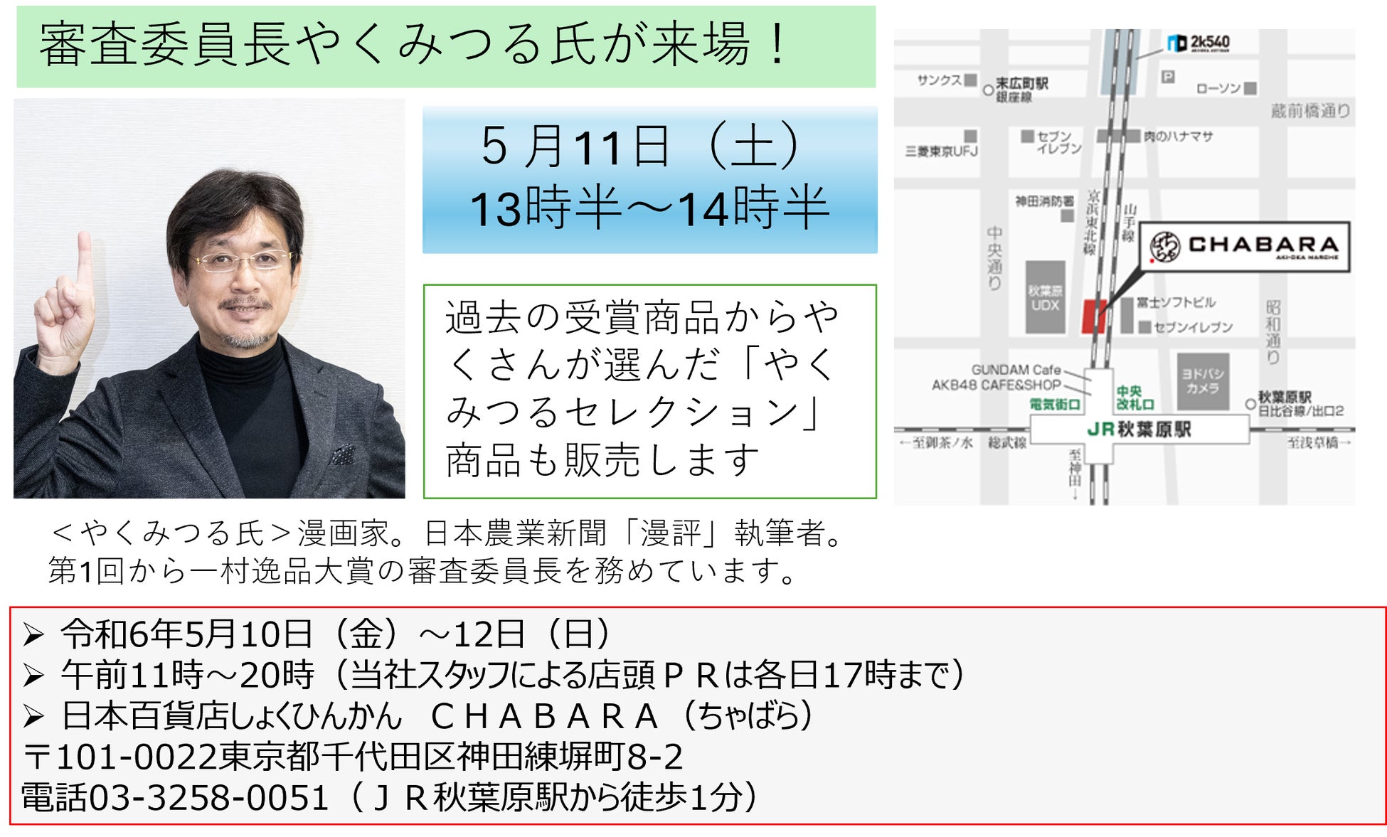 5月10日(金)から3日間、JR秋葉原駅近くの「日本百貨店しょくひんかん」で開催します。今年と過去の大賞・金賞・優秀賞受賞の中から、約20アイテムが勢ぞろいします。
