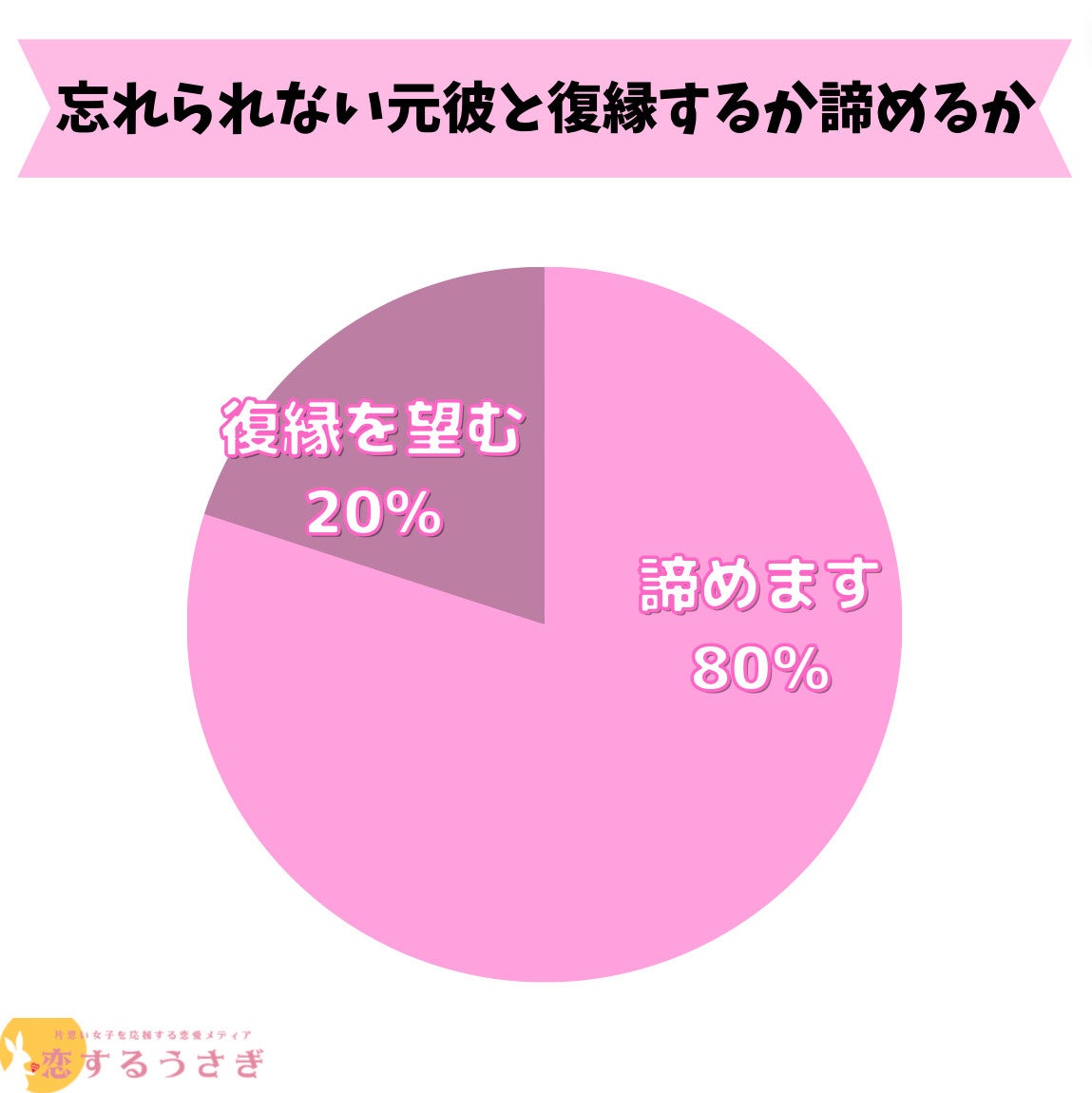 恋するうさぎ編集部が行った『忘れられない元彼と復縁するか諦めるか』のアンケートによると80%が『諦める』、20%が『復縁を望む』という結果になりました。