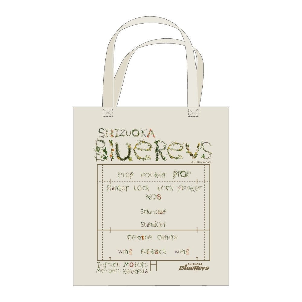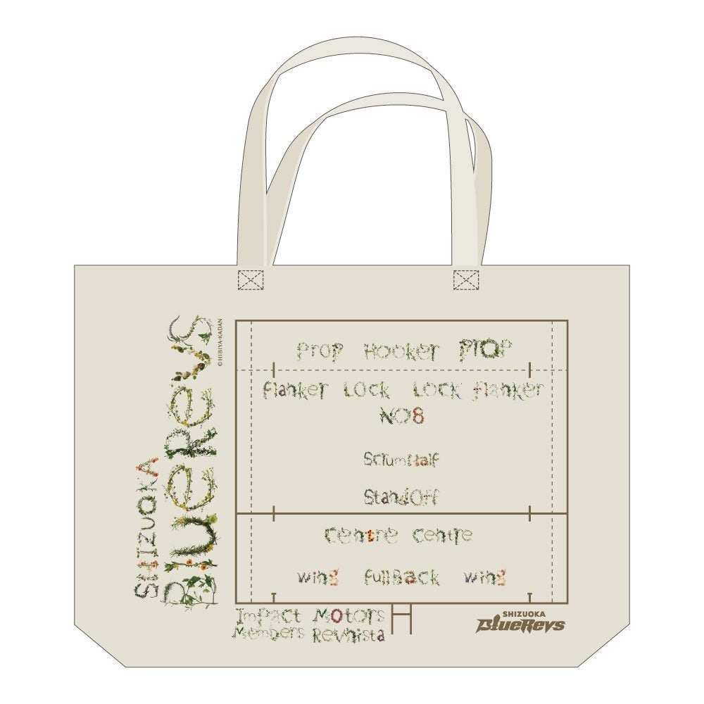 静岡ブルーレヴズの花文字デザインと、ラグビーコートにポジション名が花文字で描かれているラグビー要素の詰まったコラボトートバッグ。