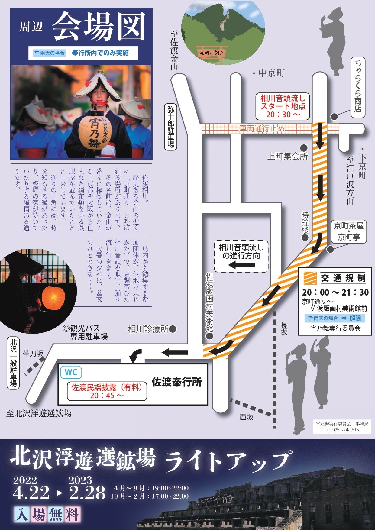 相川京町通りから佐渡奉行跡までの間、島内の民謡団体が、相川音頭を唄い、踊り流しを行います。