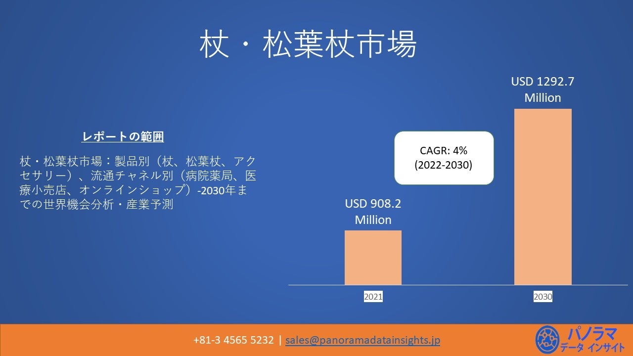 2021年の世界の杖・松葉杖の市場規模は908. 2百万米ドルでした。世界市場は、2022年から2030年までの予測期間中に年平均成長率(CAGR)4%で成長し、2030年には1292.7百万米ドル に達すると予測されます.