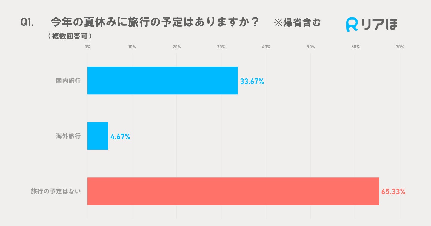 全国に住む20代~40代の男女に近夏の旅行の予定について質問したところ、国内旅行を予定している方は、33.67%、海外旅行は4.67%、旅行の予定はないと回答した方は65.33%となりました。