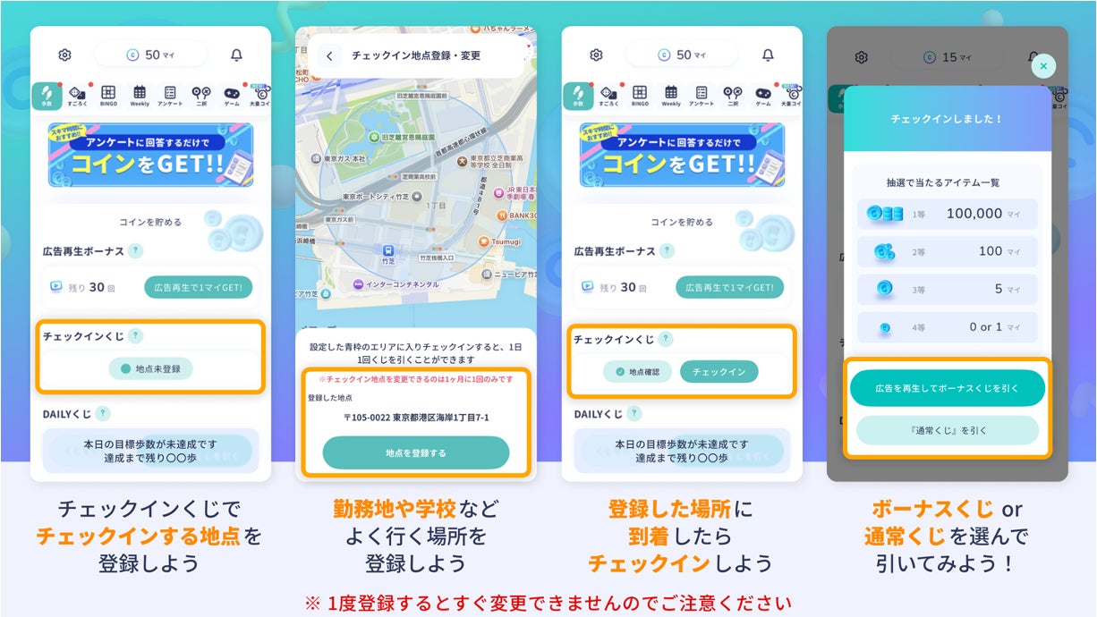 歩くだけでコインがたまり、たまったコインを「PayPayポイント」や「Amazonギフトカード」などと交換することができるスマホアプリ「アルコイン」を提供する株式会社Agoop(アグープ、本社:東京都渋谷区、代表取締役社長 兼 CEO:加藤有祐)は、2025年8月4日からiOSアプリ限定で新機能「チェックインくじ」のトライアル提供を開始します。「チェックインくじ」は、「アルコイン」をご利用のお客さまが、あらかじめ登録した場所にチェックインすることで、その場でコインが最大10万マイ当たる抽選に応募できる新機能です。