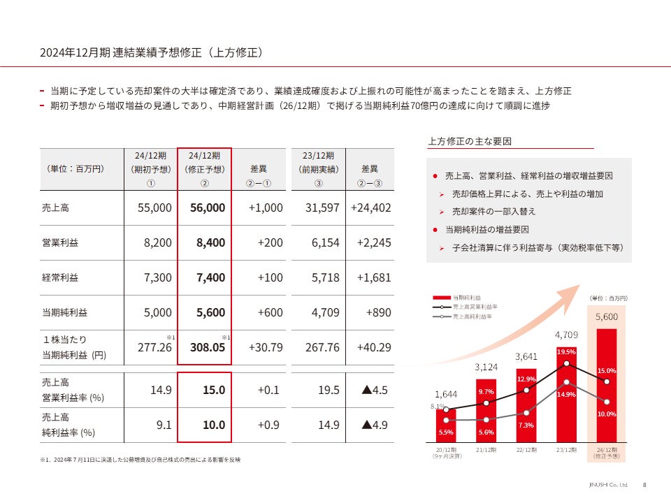 当期に予定している売却案件の大半が確定済みであり、業績達成確度および上振れの可能性が高まったことを踏まえ連結業績予想を上方修正いたしました。