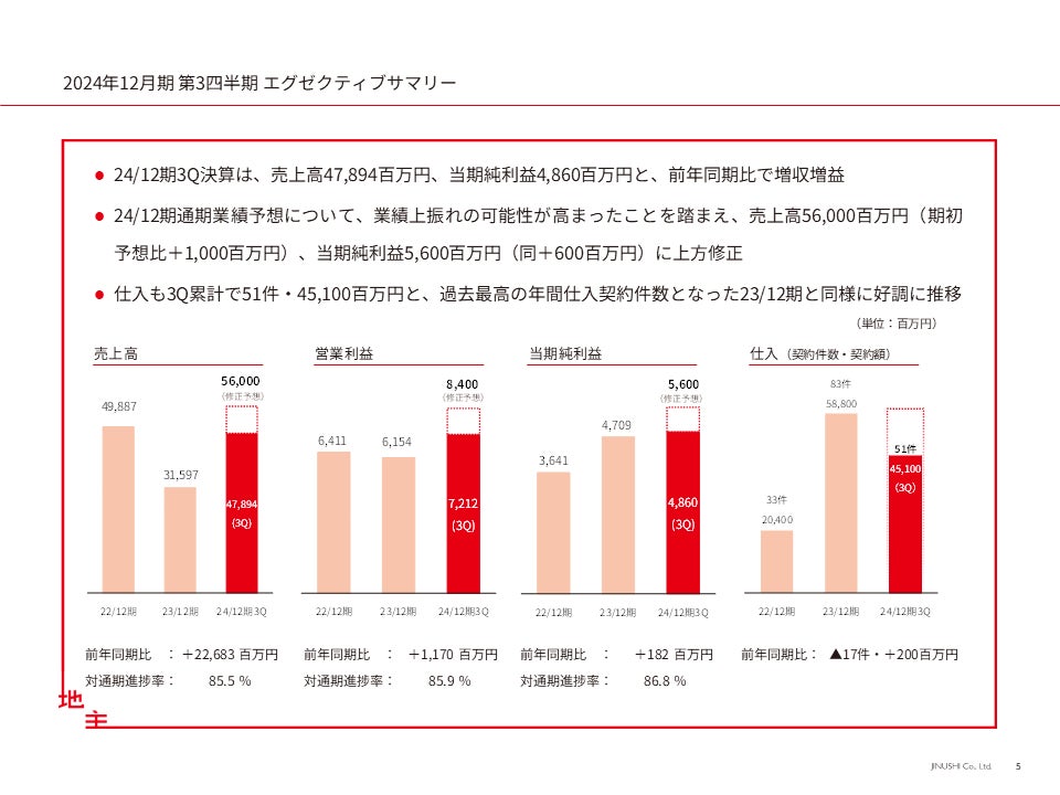 2024年12月期第3四半期については、売上高47,894百万円(前年同期比+22,683百万円)、営業利益7,212百万円(同+1,170百万円)、親会社株主に帰属する四半期純利益4,860百万円(同+182百万円)となり、前年同期比で増収増益となりました。