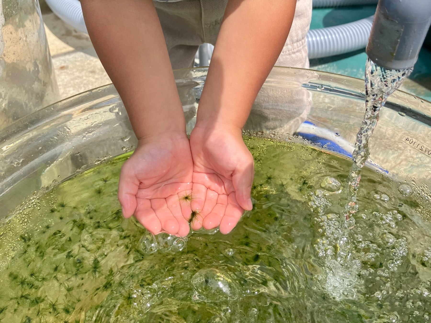 今回の体験では、水槽の中から金魚すくいのように「すじ青のりの赤ちゃん」をすくってゲット。ご自宅に持ち帰ったあとも育てられるよう、取扱説明書と観察日記を一緒にお渡しします。