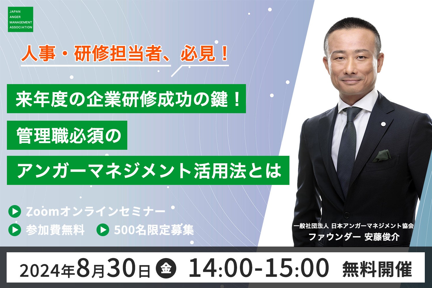 【人事・研修担当者、必見!】8月30日(金)、当会ファウンダー安藤俊介登壇「来年度の企業研修成功の鍵!管理職必須のアンガーマネジメント活用法とは」無料オンラインセミナー開催決定!
