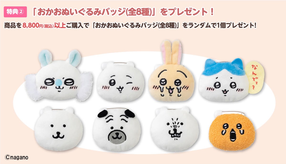 「おかおぬいぐるみバッジ(全8種)」をランダムで1個お渡しします。