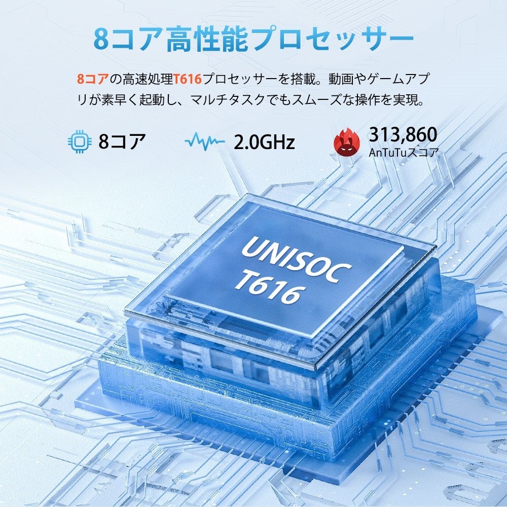 CPU(SoC)にはUNISOC T616 オクタコアプロセッサーを、RAMは8GBを採用。一般的なタブレット用途は問題なくスムーズにこなせるだけの性能を擁しています。RAMは最大24GBまでの拡張が可能で、よりスムーズなタブレット操作を楽しめるようになります。