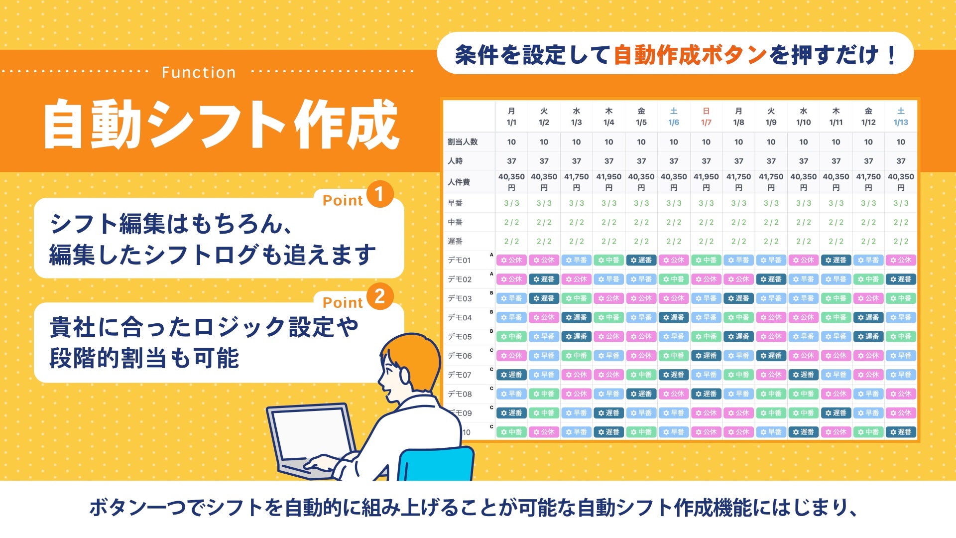 有料プランでは、出勤インターバルや連勤アラートなどにも対応した高度な自動シフト作成機能に加え、出勤要請、労務管理、概算人件費計算などの機能も備えています。「勤怠管理プラン」では、打刻や出退勤記録をはじめとした勤怠管理機能も利用いただけます。