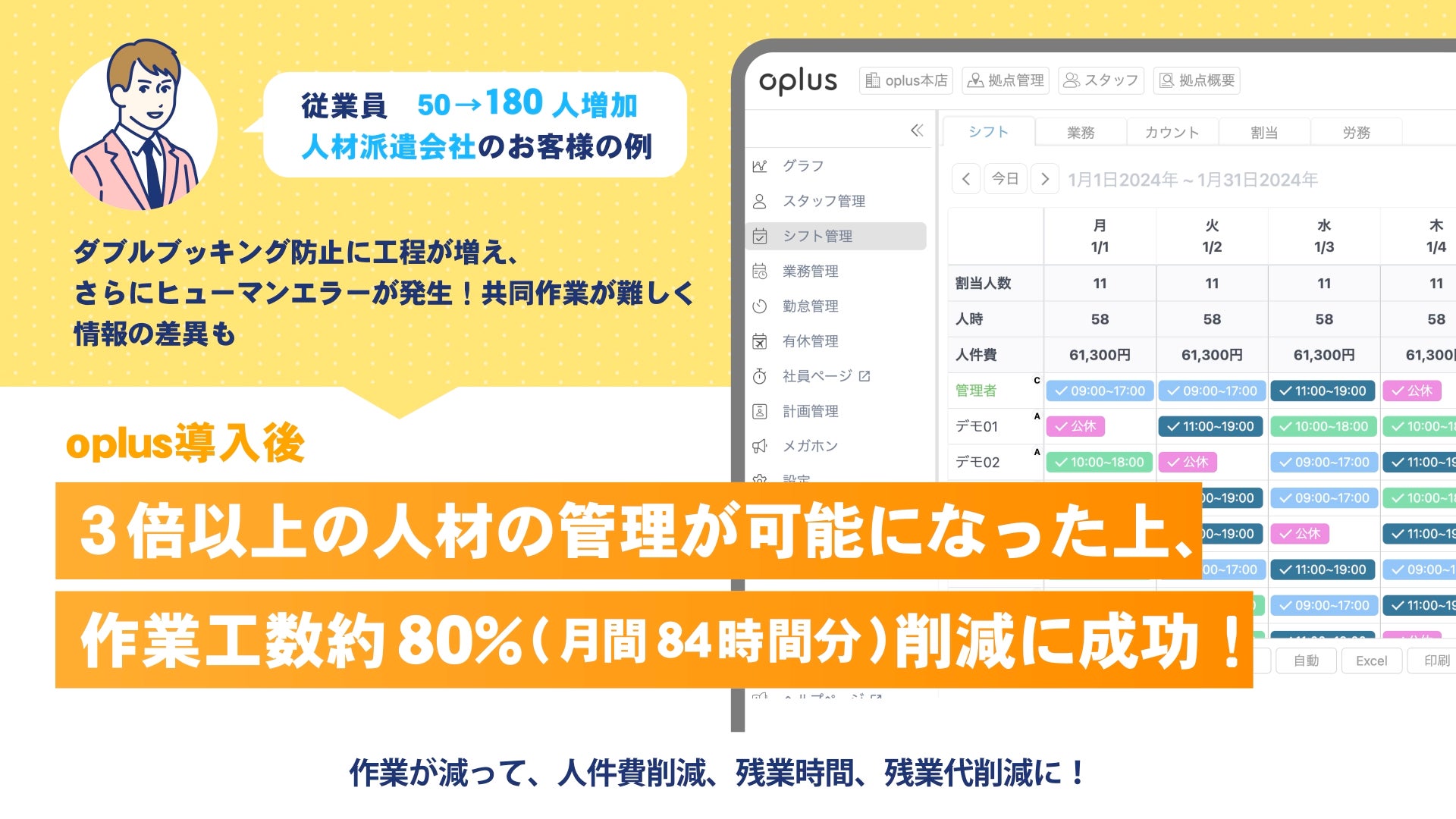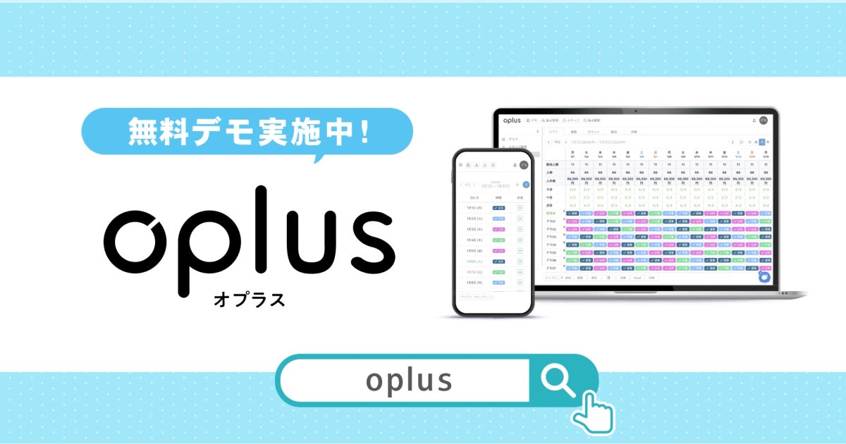 「oplus」は、ブラウザ・スマホ・アプリの全てに対応したシフト・勤怠管理DXサービスで、企業の省人化・省力化の実現を支援します。シンプルで直観的に操作でき、100名まで無料で利用いただけるプランもあり、紙・エクセルから脱却する上で気軽に導入いただけます。