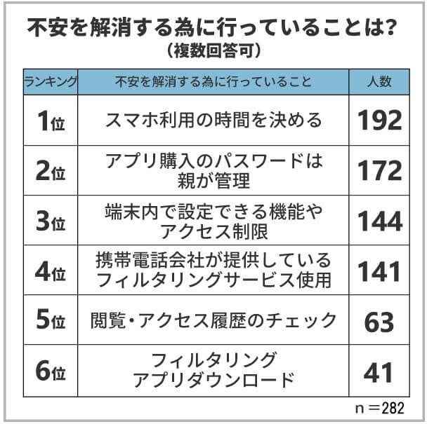 「子供にスマートフォンを持たせる時に心配だった」と回答した282人の保護者に「不安を解消する為に行っていること」を複数回答で聞いてみたところ、「スマホ利用の時間を決める」「アプリ購入のパスワードは親が管理」などが上位となりました。