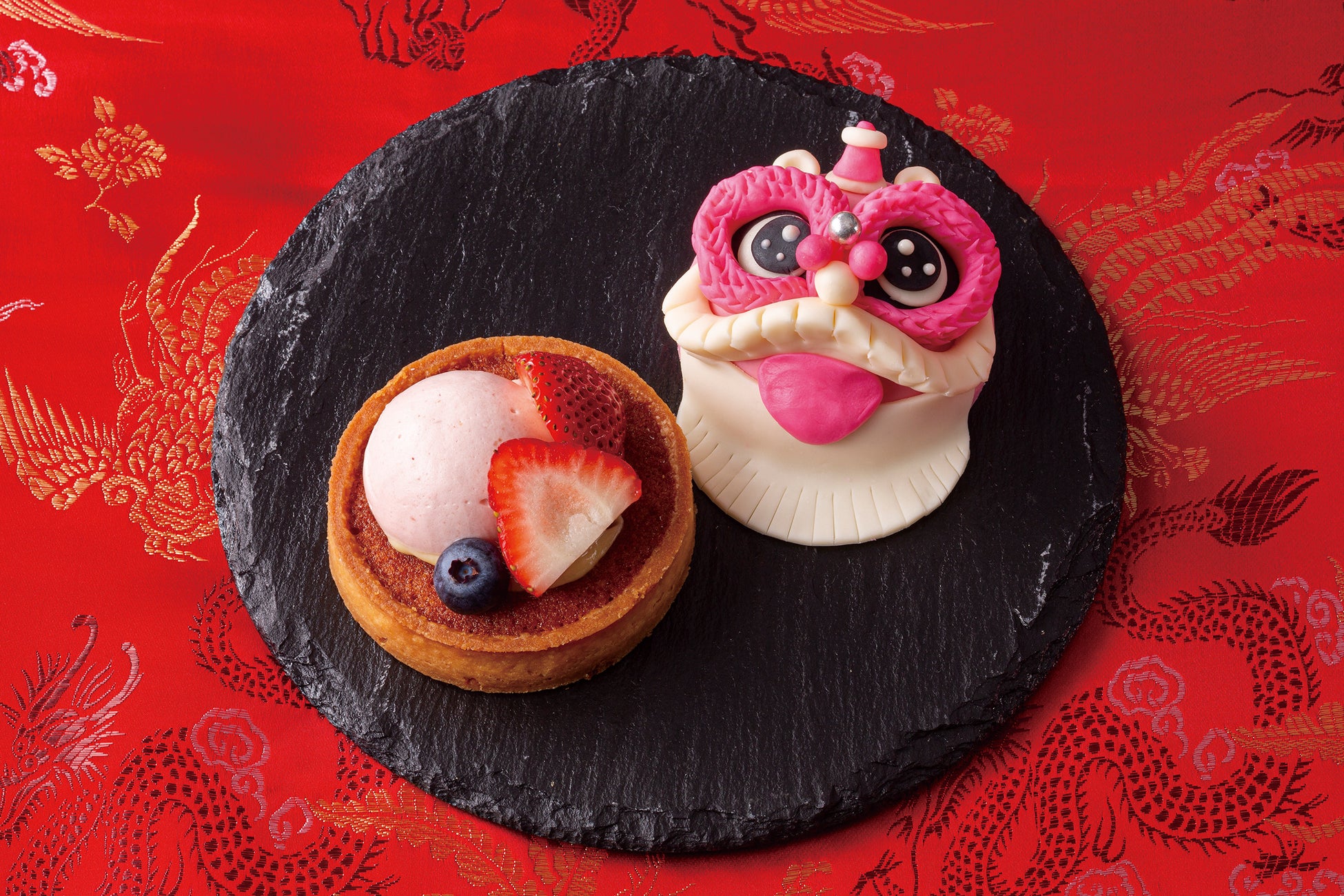 「駆邪」と「降福」の象徴として年中行事として欠かすことのできない中国獅子をかたどったスイーツは、ホテルパティシエによりひとつひとつ手作り。ホワイトチョコレートで作られる可愛らしい表情は、凛々しい顔もあれば愛らしい顔もあり、見ても食べても楽しい『春節タルト』を、開運の意味を込めて「翡翠」「朱」「黄金」の3種ご用意いたします。安定や平穏、健康長寿を意味する「翡翠」は濃厚なピスタチオムース、古来より厄除けの意味を持つ「朱」はストロベリームース、太陽の輝きに見立てた「黄金」は、甘酸っぱい爽やかなオレンジムースで仕上げました。またご予約限定で「翡翠」「朱」「黄金」の3色セットもございますので、ぜひご家族やご友人の皆様でお楽しみください。