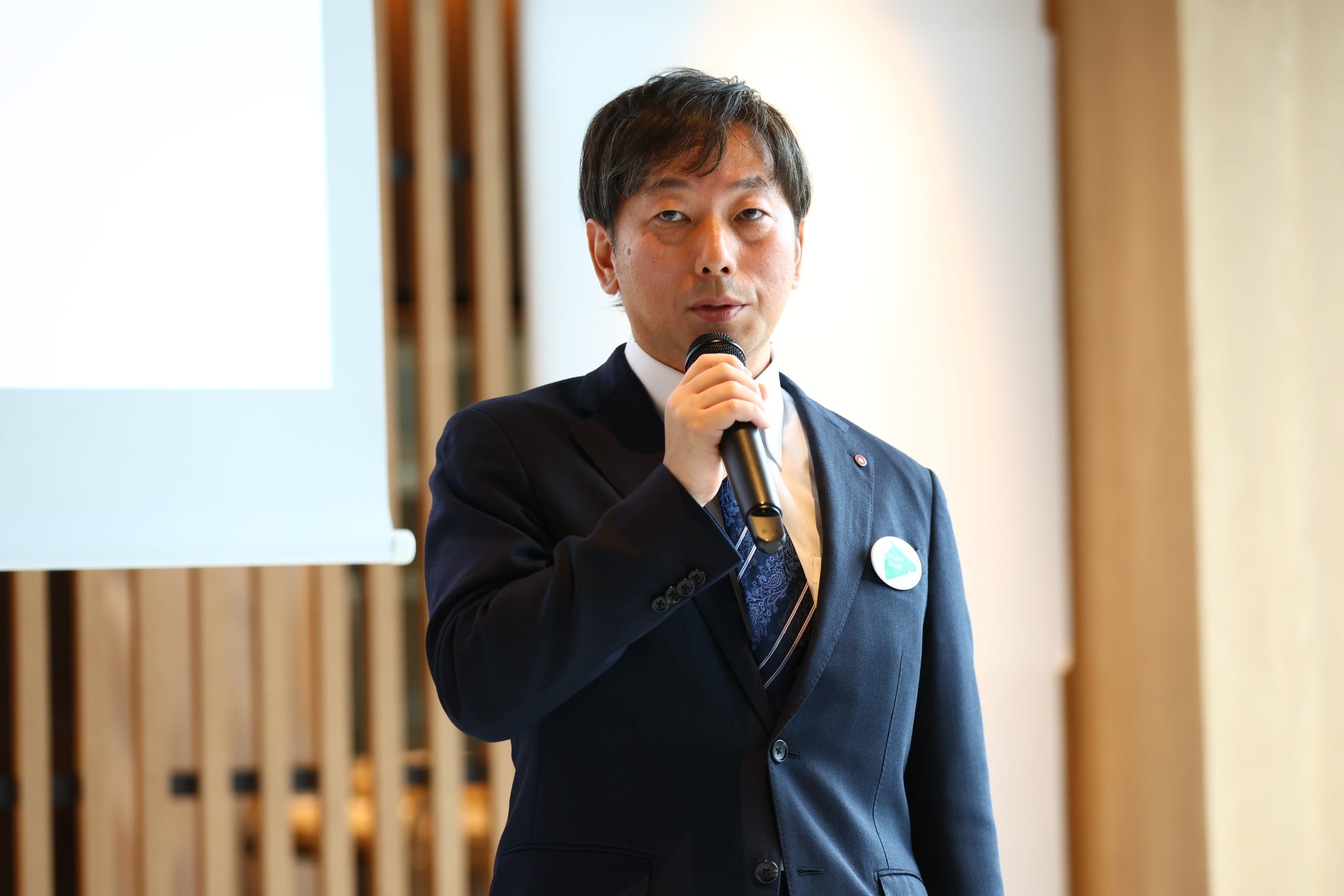 会の冒頭では、六甲バター株式会社 代表取締役社長兼CEOの塚本が登壇。大阪・関西万博「QBB これもいいキッチン」に関する説明と、チーズ代替植物性食品の今後についてお話しました。