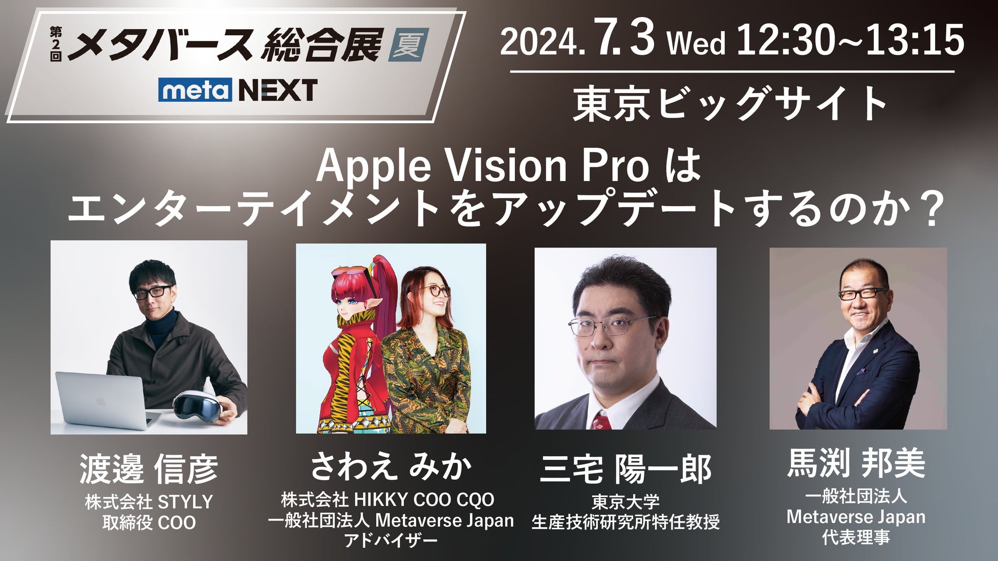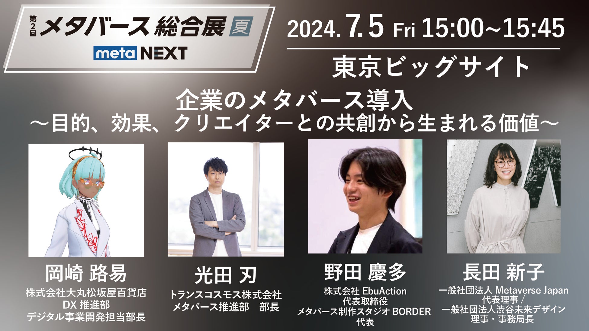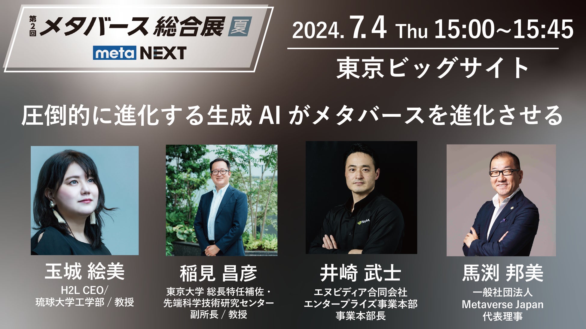 一般社団法人Metaverse Japan (代表理事:長田新子、馬渕邦美、以下Metaverse Japan)は、2024年7月3日(水)から7月5日(金)までの3日間、東京ビッグサイトにて開催される「第2回 メタバース総合展夏」に、代表理事の長田新子、馬渕邦美がアドバイザリーコミッティとして参加し、3つの特別セミナーを実施します。