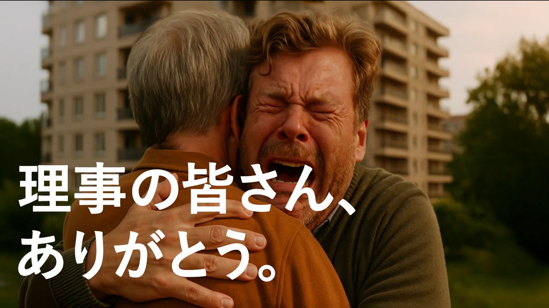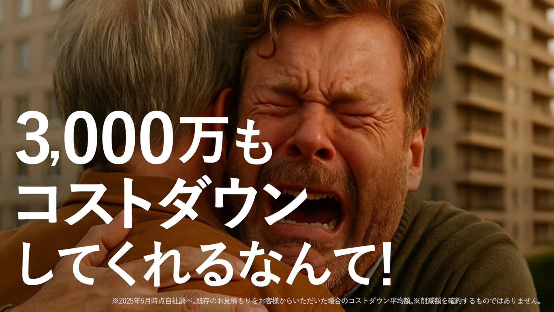 今回の新CMでは、2つの映像にアテレコ形式で「お隣のマンションが大規模修繕を大きくコストダウンしていて驚く男性」、「理事が頑張ってコストダウンをしてくれて涙ながらに喜ぶ男性」を表現しまています。普段意識し辛い、また、人任せになりがちな「お住まいのマンションの大規模修繕のコストダウン」について興味を持つきっかけになればとコミカルに表現しました。