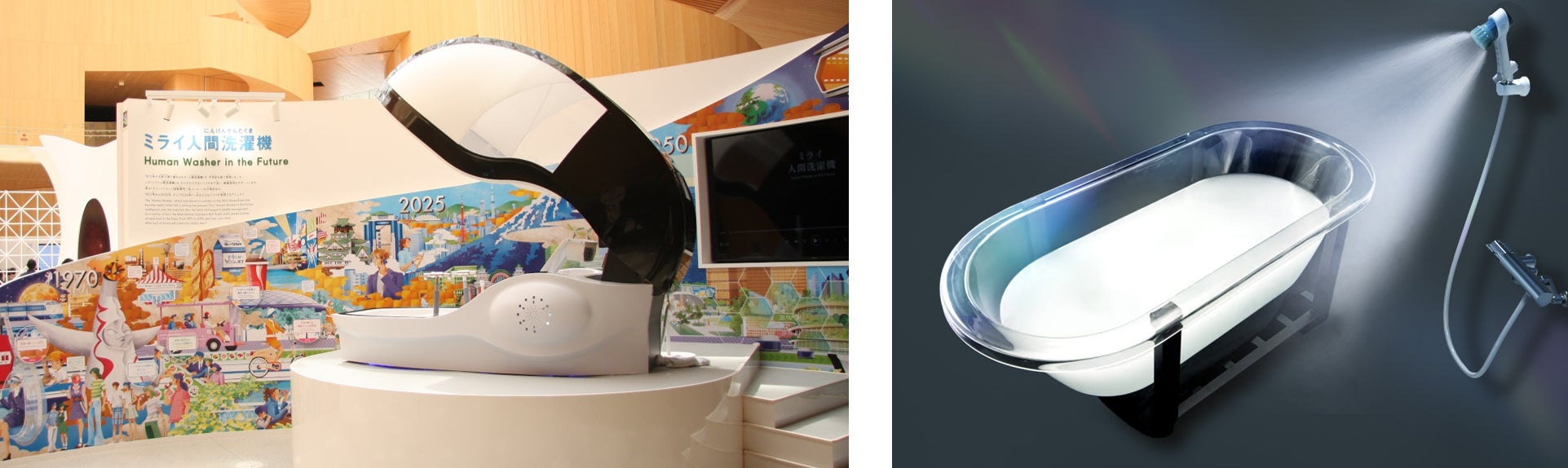 2025年大阪・関西万博の大阪ヘルスケアパビリオンに出展中の「ミライ人間洗濯機」は「カラダもココロも自動で洗われる時代へー」をコンセプトとしています。カラダを洗う部分では、ミラブルテクノロジーが活用されており、また、身をゆだねているだけで背面のセンサーを使用して入浴者の心電図をモニタリングし、よりリラックスやリフレッシュができる空間を演出。ミライの浴室環境における新習慣を提案しています。