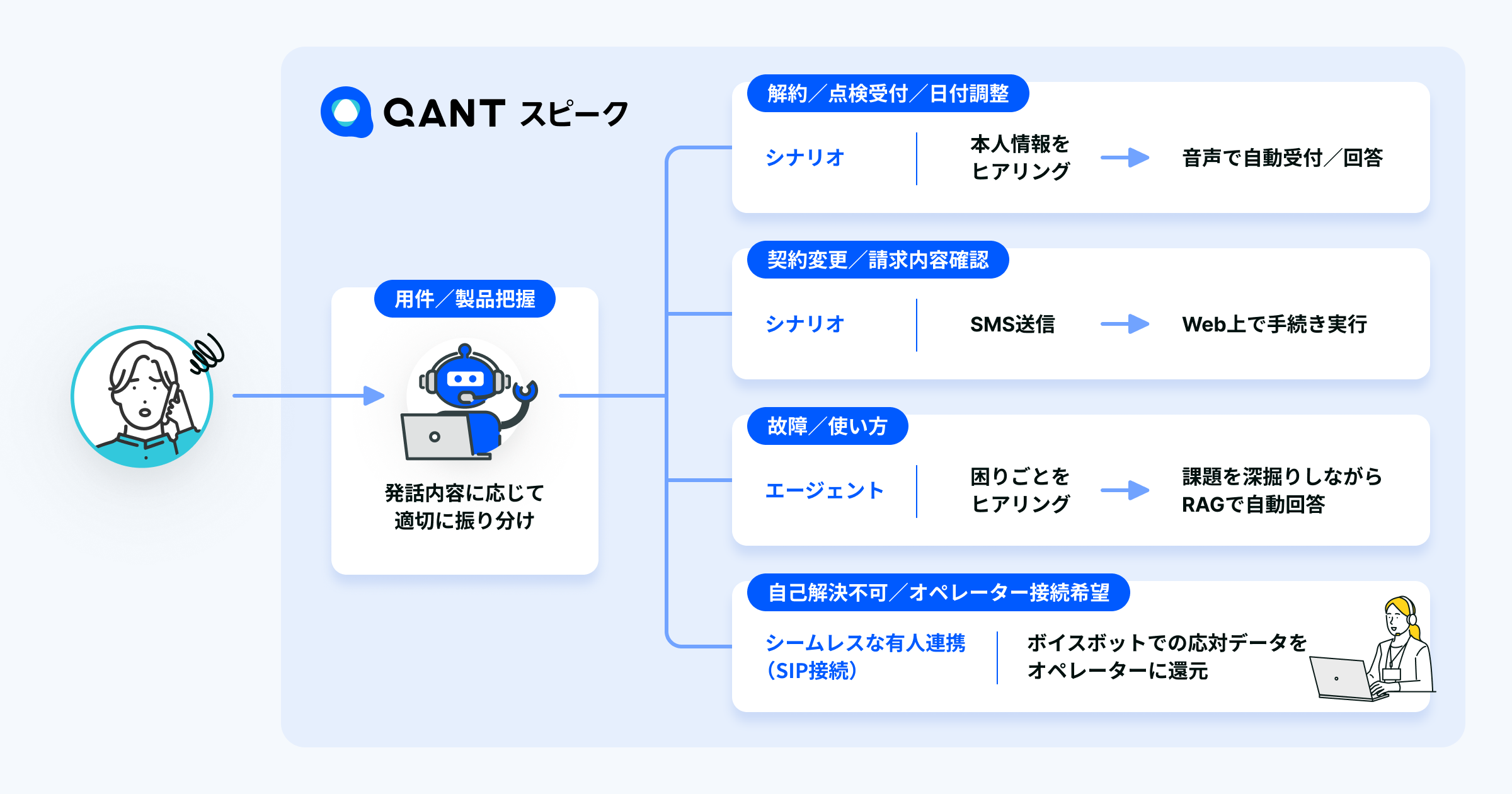 そこで、顧客の発話をもとに適切な対応先へ即時に振り分ける仕組みと、AIオペレーターが一次受付をすることでオペレーター負荷を軽減しながら均一で安定した初期対応を提供できる点が評価され、QANT スピークの導入が決定しました。