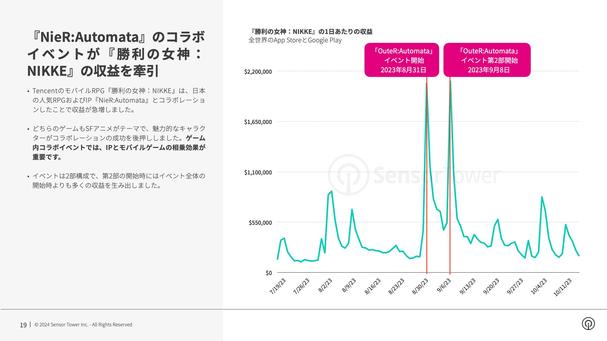 また一方で、何かに特化しているからといって必ずしも不利とは限りません。むしろ、モバイルゲームとIPパートナーの間に強力な相乗効果が生まれれば、収益を大きく押し上げることもあります。例えば、モバイルゲーム『勝利の女神:NIKKE』は最近、PC/コンソールゲームのIP『NieR:Automata』とゲーム内イベントで提携し、大きな収益を上げました。