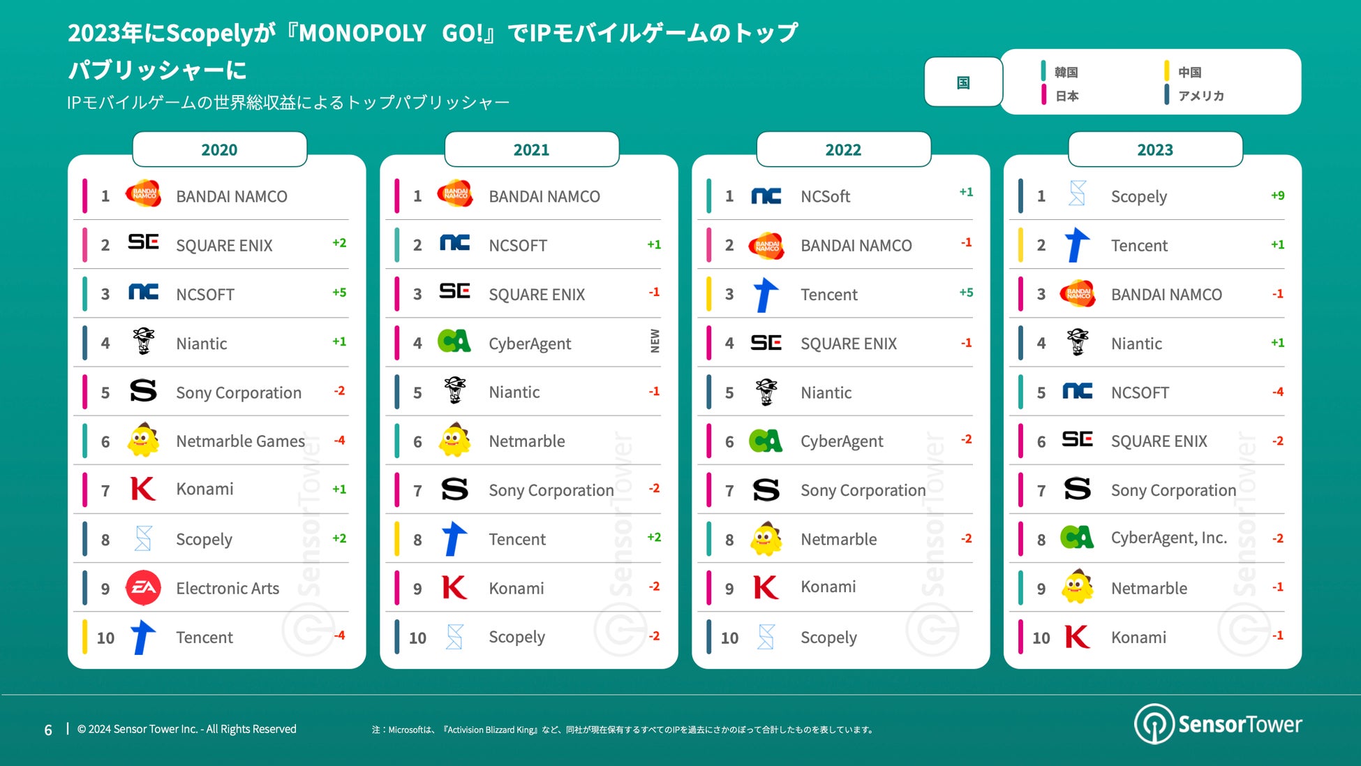 2021年と2022年には、『ドラゴンボールZ』のゲームでモバイルでの成功を収めている日本のパブリッシャーBandai Namco Entertainmentと、『リネージュ』シリーズの開発元である前述の韓国のパブリッシャーNCSOFTが、IPモバイルゲームの収益トップ2を占めました。これらの年にはScopelyもランクインしましたが、『Star Trek 艦隊コマンド』や『MARVEL ストライクフォース』などによって辛うじて10位に入りました。『MONOPOLY GO!』をリリースしたことで、Scopelyは9ランクアップしてトップになりました。もう1つの興味深い傾向は、Tencentが『リーグ・オブ・レジェンド:ワイルドリフト』によって2位に浮上したことです。このモバイルMOBAは欧米ではそこまでの勢いはありませんが、中国では驚異的な成功を収めており、世界最高の収益を上げているゲーム『Honor of Kings』が『リーグ・オブ・レジェンド』から着想を得たモバイルMOBAであり、同じくTencentが所有していることを考えれば、それほど意外ではありません。