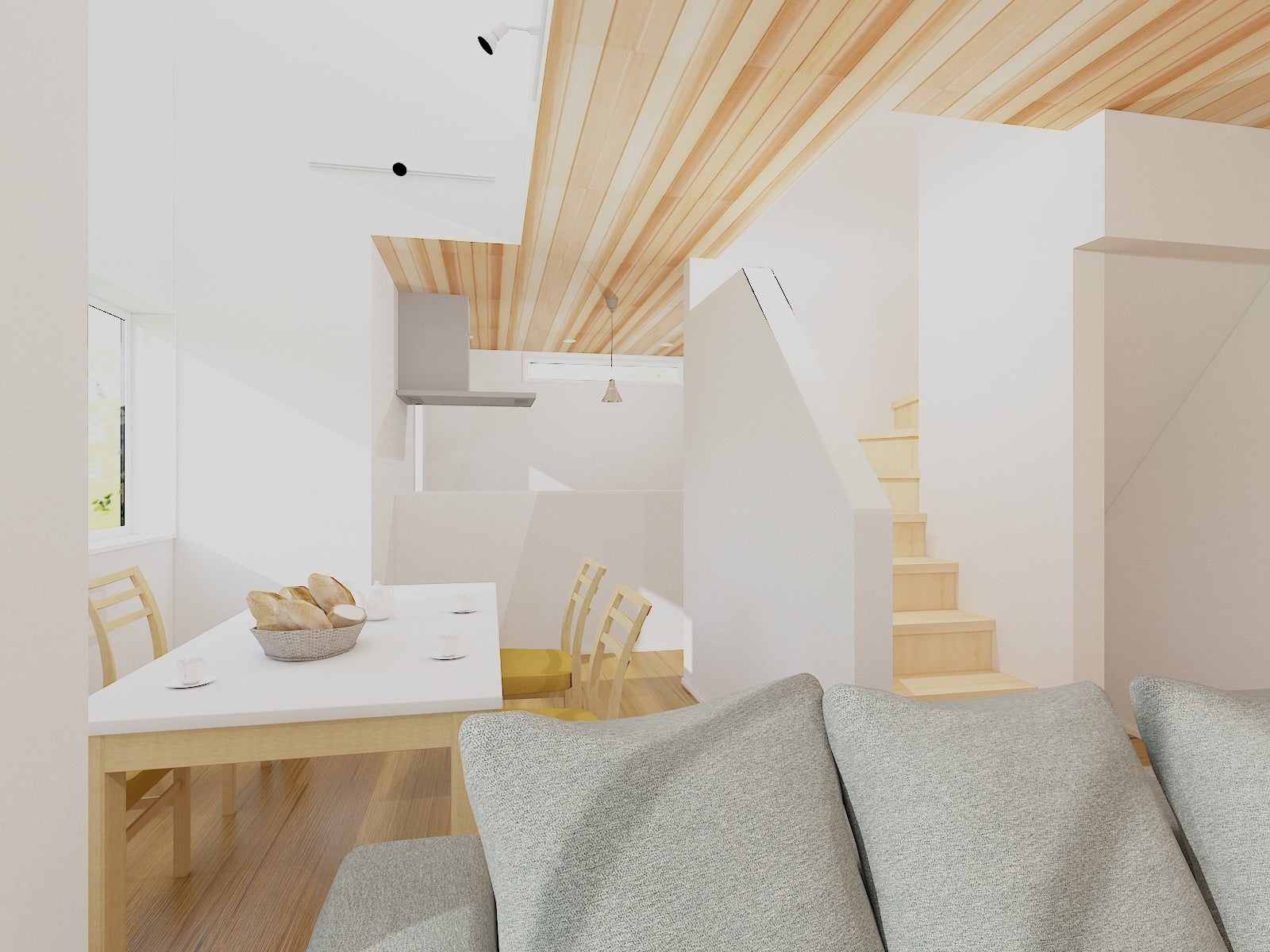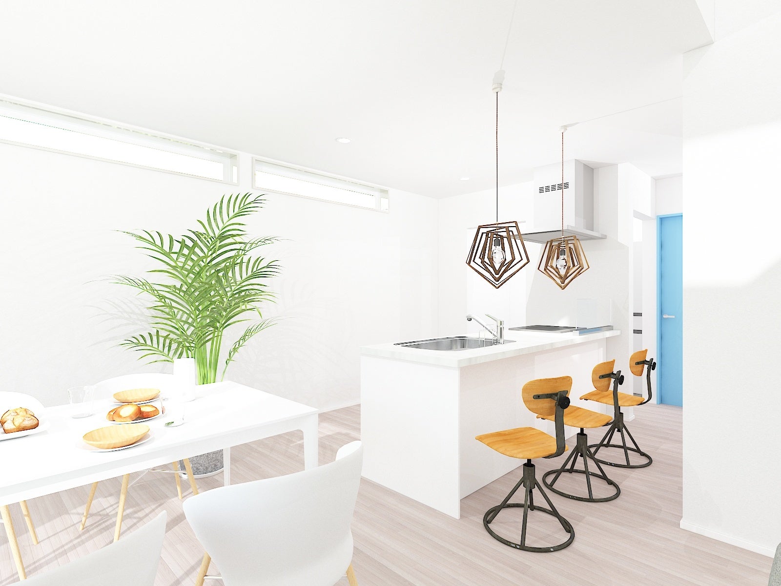 ビーチテイストを感じさせる、開放的なカバードポーチが特徴のデザイン。勾配天井を活かし広々としたLDKは、サッシの開放によりリビングスペースが拡張し、オープンで爽快な時間を過ごせます。
