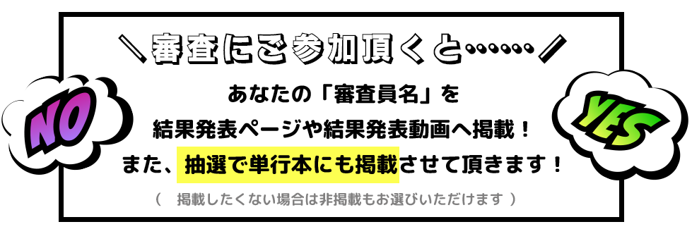 - <審査特典 その②>審査員名 (ハンドルネーム・ペンネーム・ネット用のお名前等OKです) の掲載!