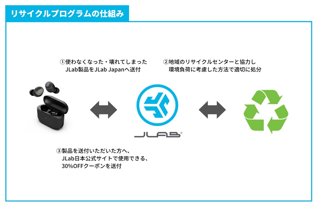 JLab Japanのリサイクルプログラムは、使わなくなった・壊れてしまったJLab製品を回収し、ご協力いただいた方へ、JLab日本公式サイト(公式通販)で使用できる、30%OFFクーポンをお送りするプログラムです。