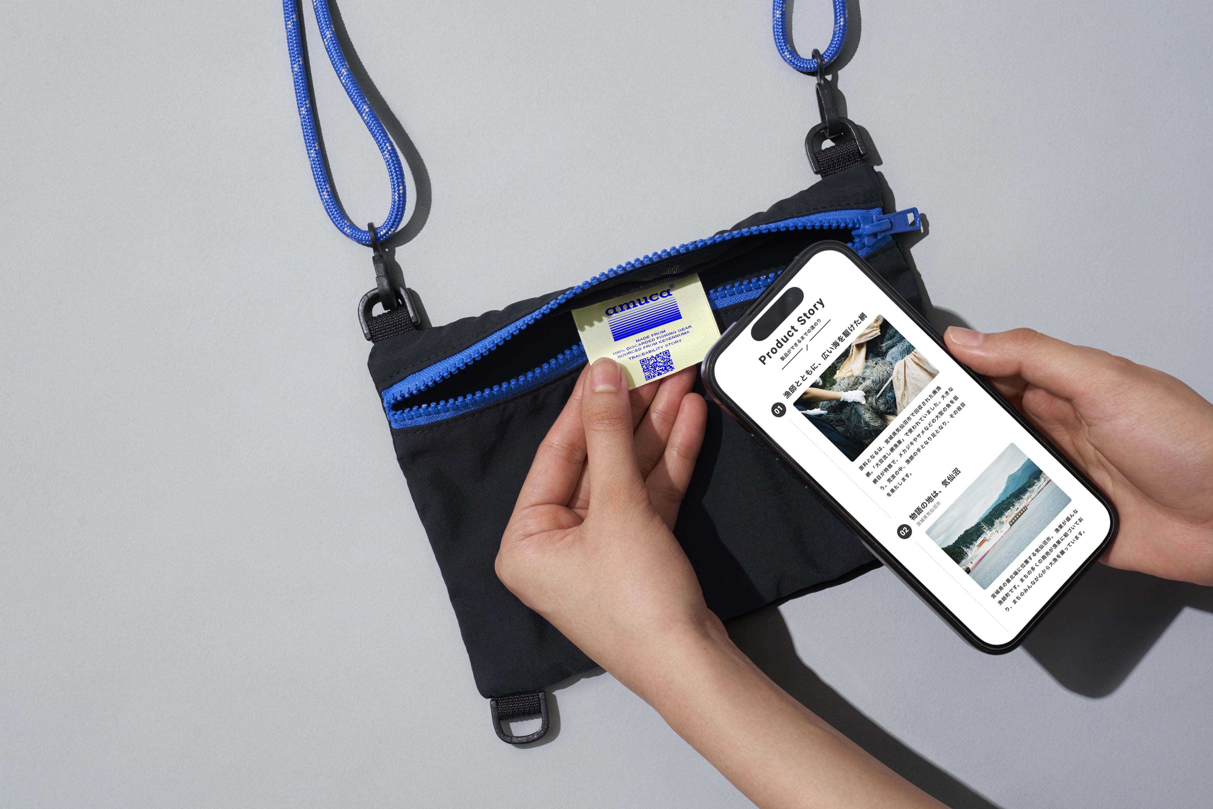 製品に付く「amuca®タグ」に記載されたQRコードを読み取ることで、原材料となる廃棄漁具の回収地域や製品化までのプロセスを知ることが可能です。