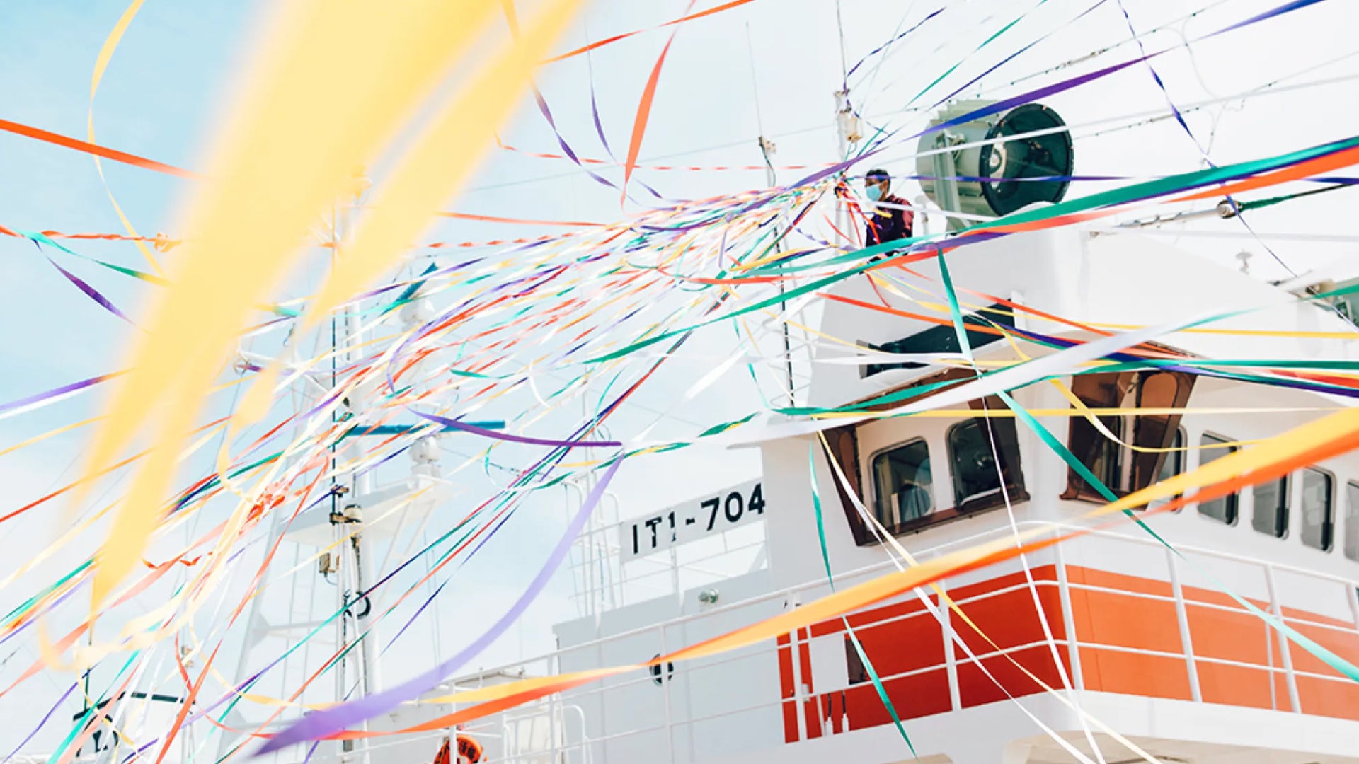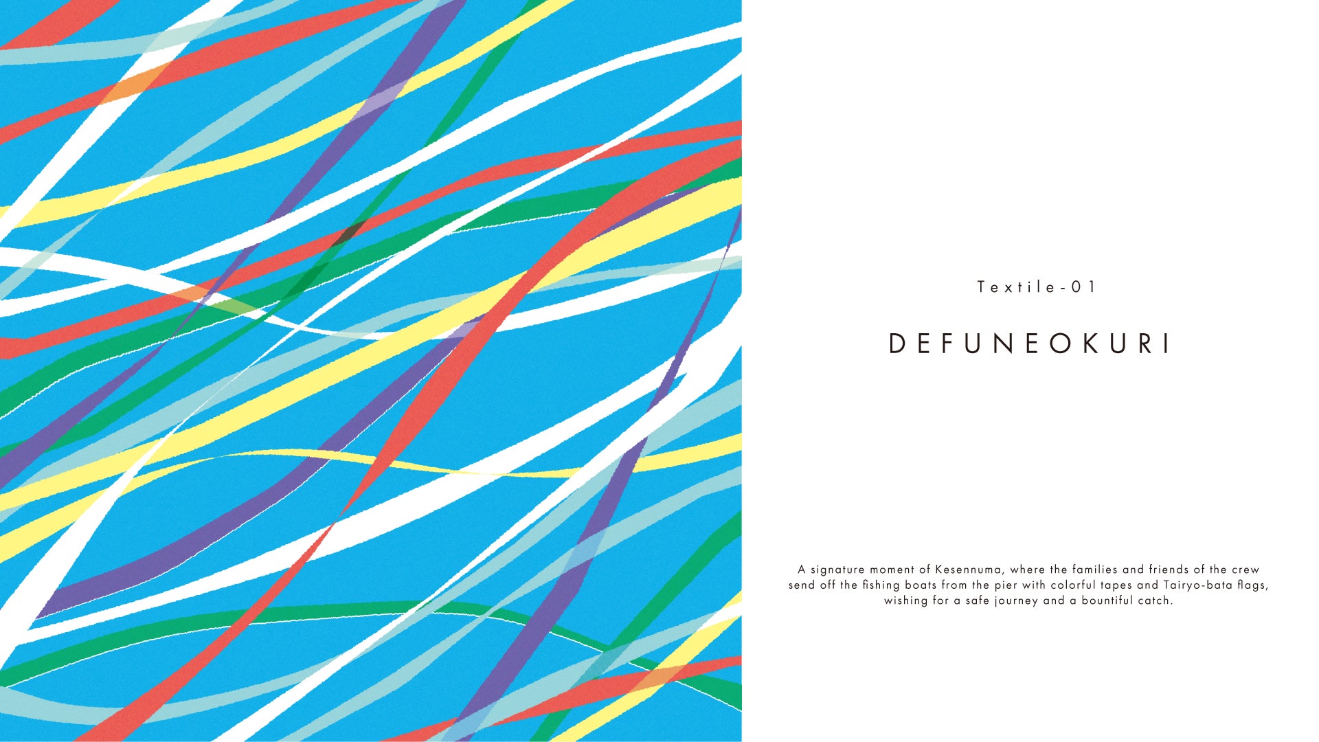 「出船おくり」という気仙沼の伝統行事のワンシーンを切り取ったもの。いざ出航と意気込む船を、乗組員の家族や友人らは、色鮮やかなテープと福来旗(大漁旗)で見送るというのが慣例です。航海の安全と大漁を願う温かく賑やかな景色をテキスタイルに落とし込むことで、プロダクトを使う方の挑戦を見守る存在でありたいという想いが込められています。