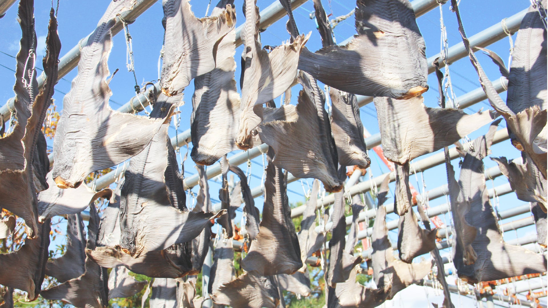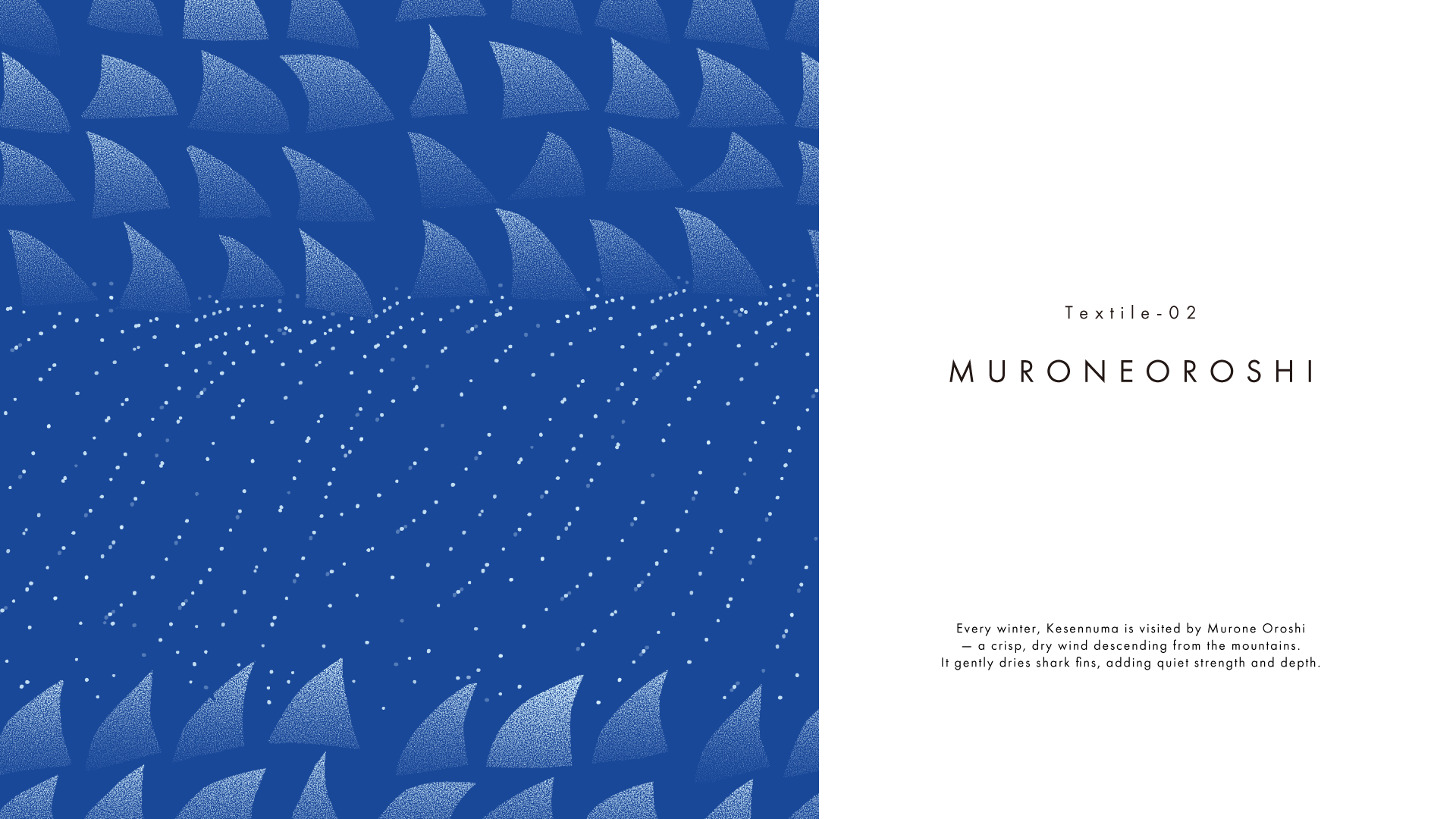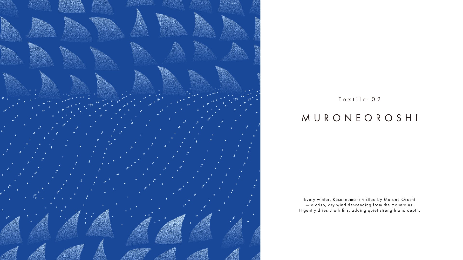気仙沼の名産品・フカヒレ作りに欠かせない「室根おろし」と呼ばれる風を反映しています。冬の室根山から吹きつける、手の切れるような冷たい風です。この冷たさが、天日干しをしているフカヒレを乾燥させます。吹かれたフカヒレがぶつかり合って鳴らす“カランカラン”という音が、完成の合図になっているそう。過酷な環境を味方に変える力強さを届けたいと思い描きました。