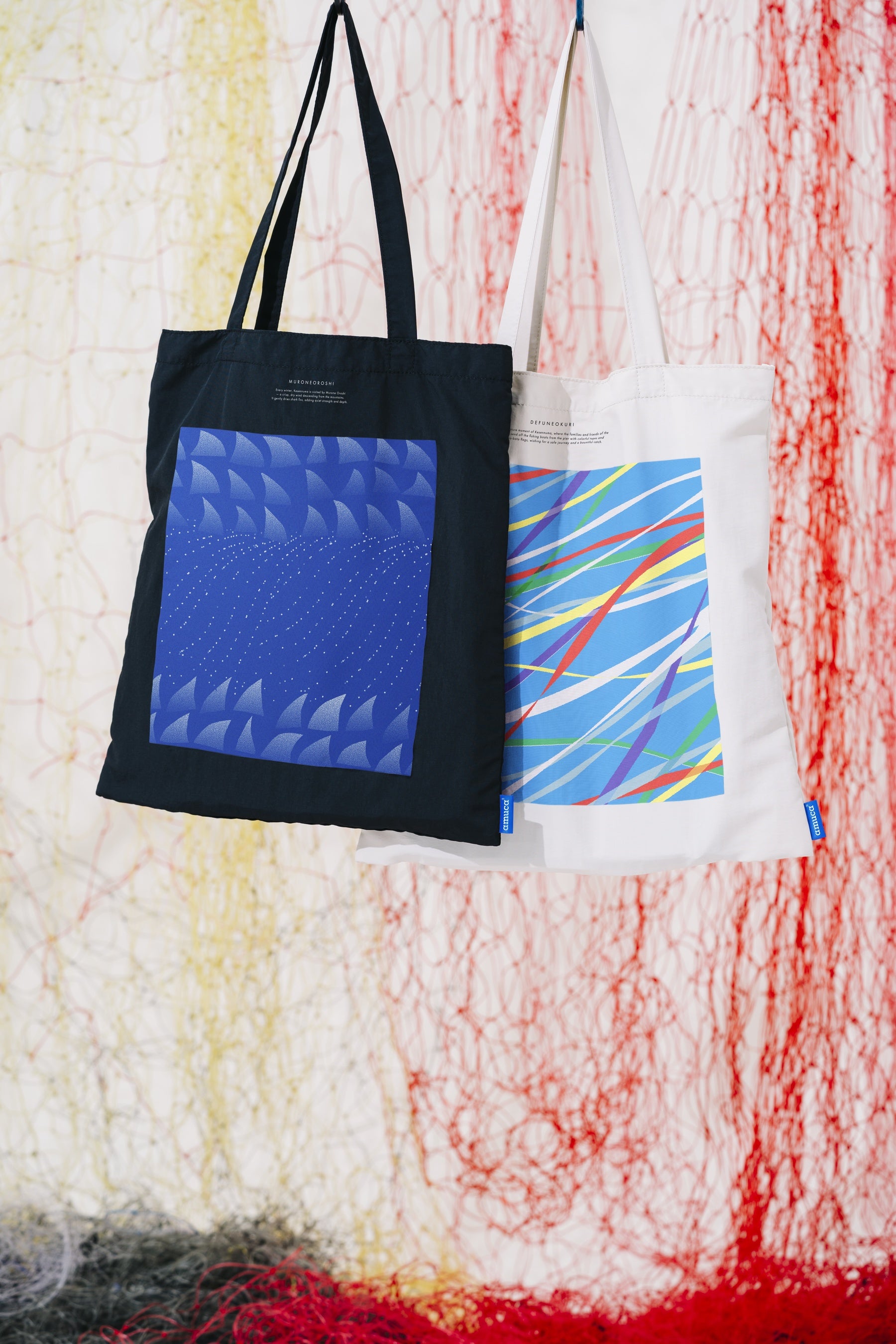 今回販売する「amuca®」製品は、amu創業の地である宮城県や、沖縄県などから回収した廃漁具が原料に使われています。一部の商品のデザインには気仙沼の文化をモチーフにした2種類のオリジナルテキスタイルデザインを採用しました。