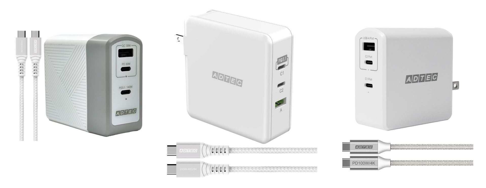 AKIBAホールディングスグループの株式会社アドテック(本社:東京都中央区、代表取締役社⻑:下津弘享、以下「アドテック」)は、140W出力に対応したPD3.1充電器「APD-A140AC2-WH-CU4G3」「APD-V140AC2-WH-CU4G3」と105W出力対応PD3.0充電器「APD-A105AC2-WH-CU3G2」を2024年10月18日(金)に発売いたします。